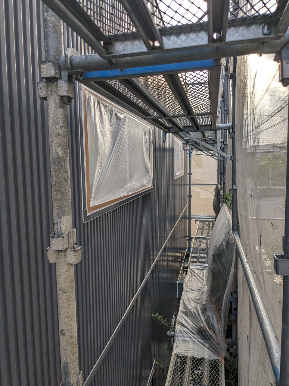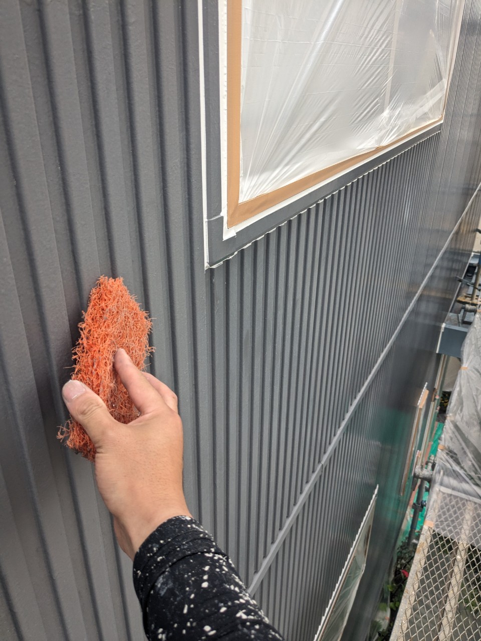 シーリングの打ち替えが完了した後に、窓サッシや土間の養生作業を行っていきます。