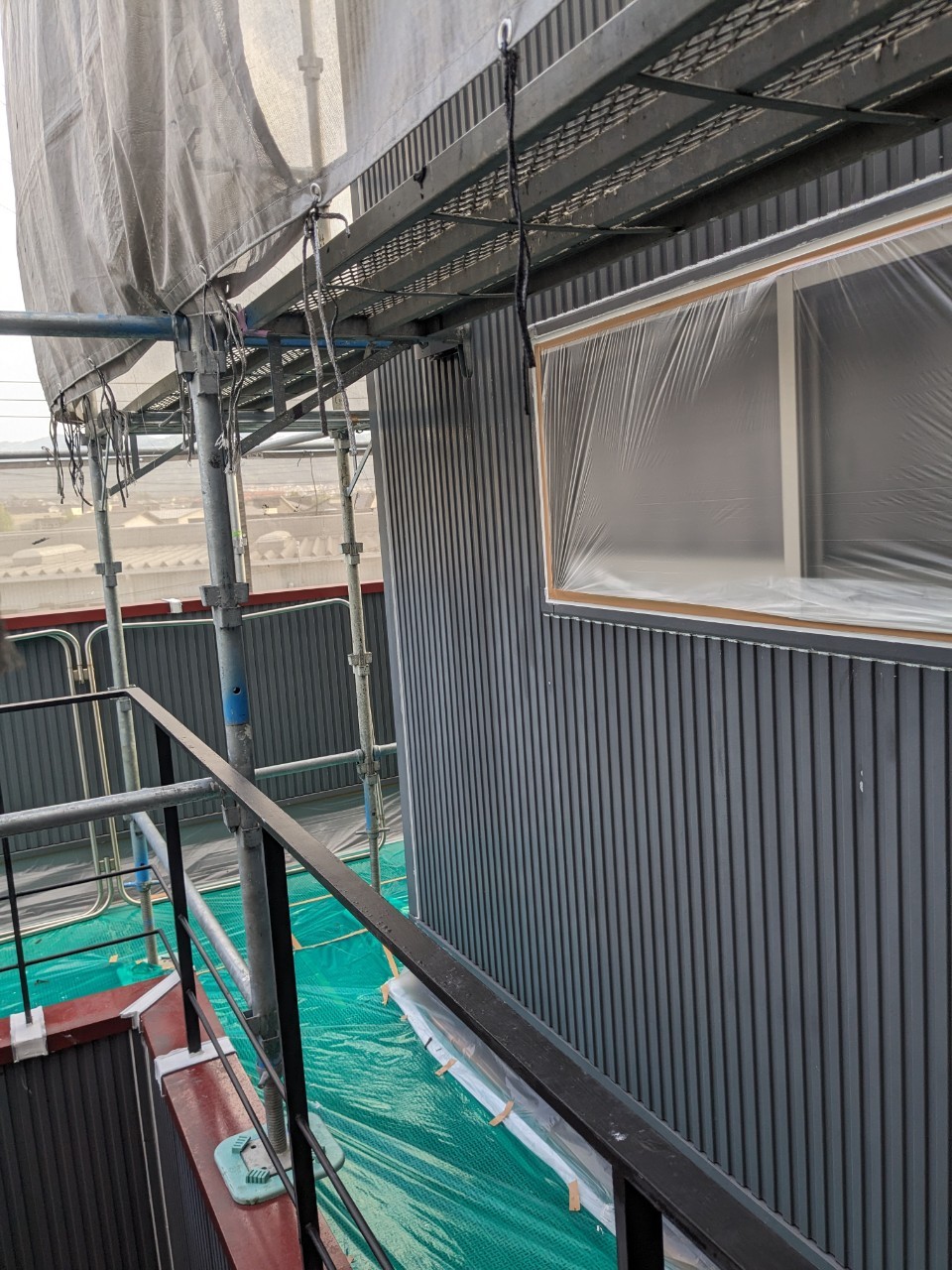 ビニールのシワやたるみが無いように養生作業を行っていきます。