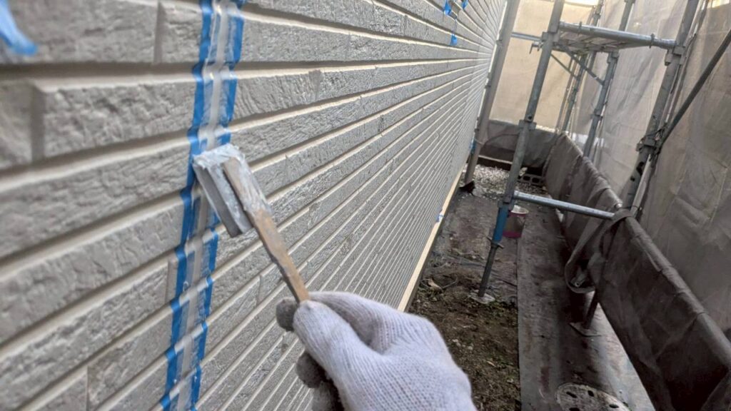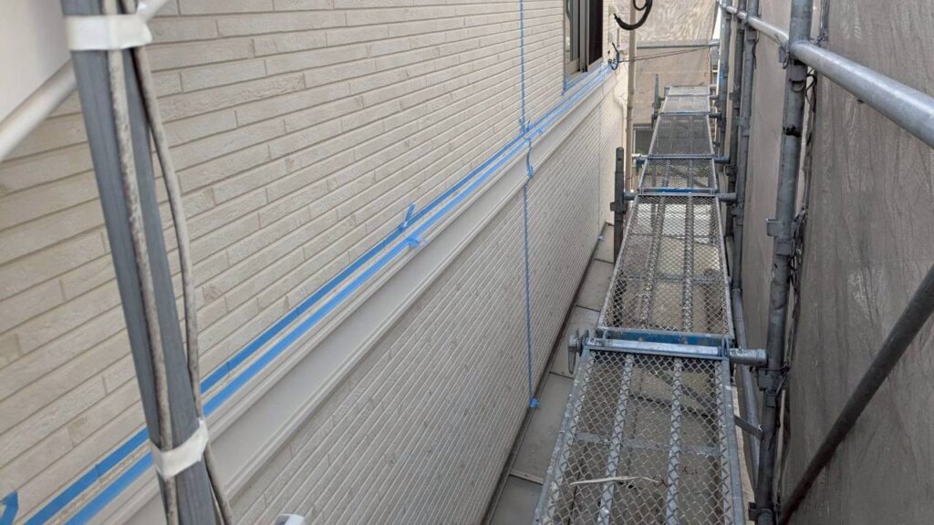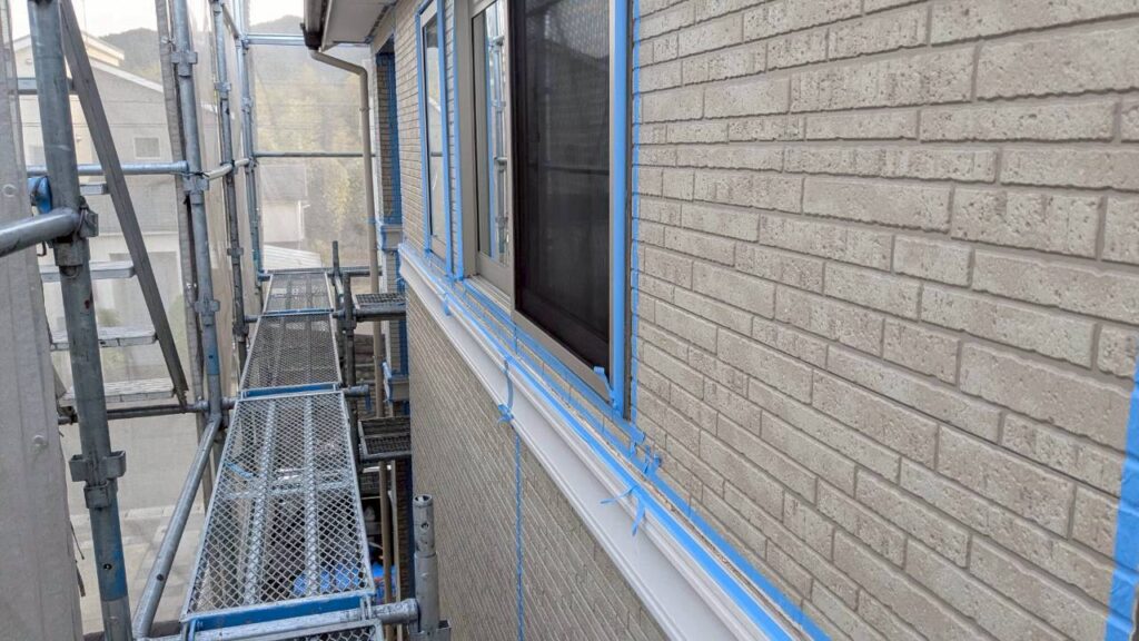 サイディングの柄に沿うようにしっかりとマスキングテープを貼っていきます。