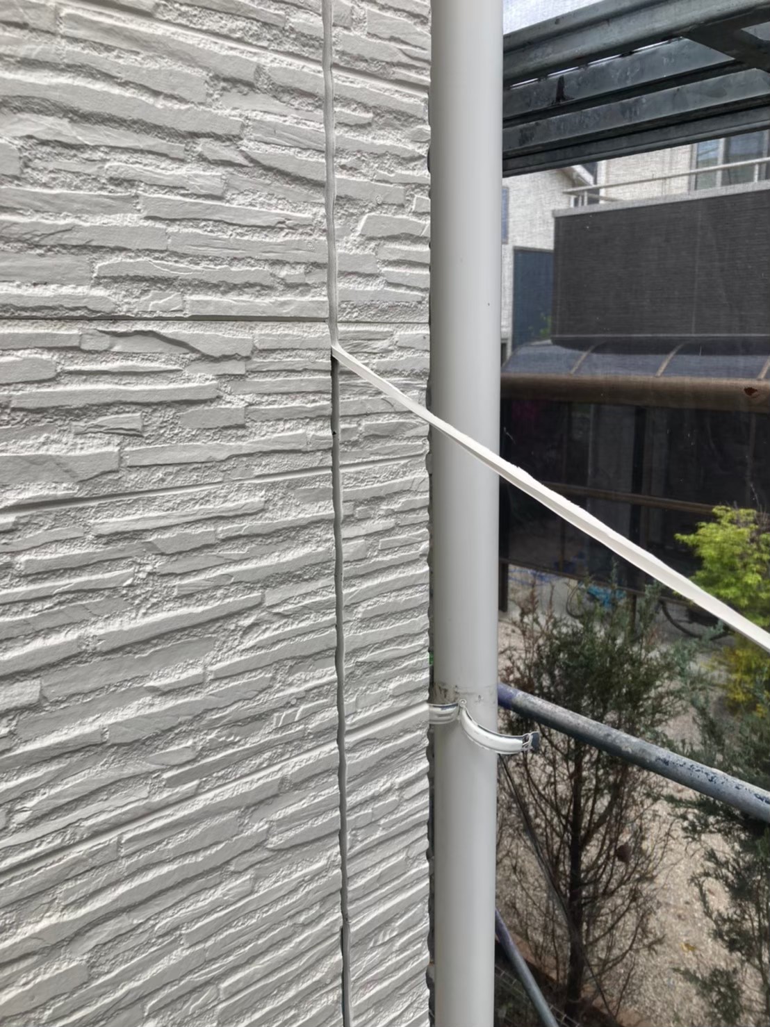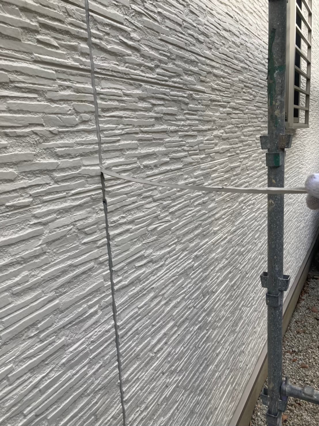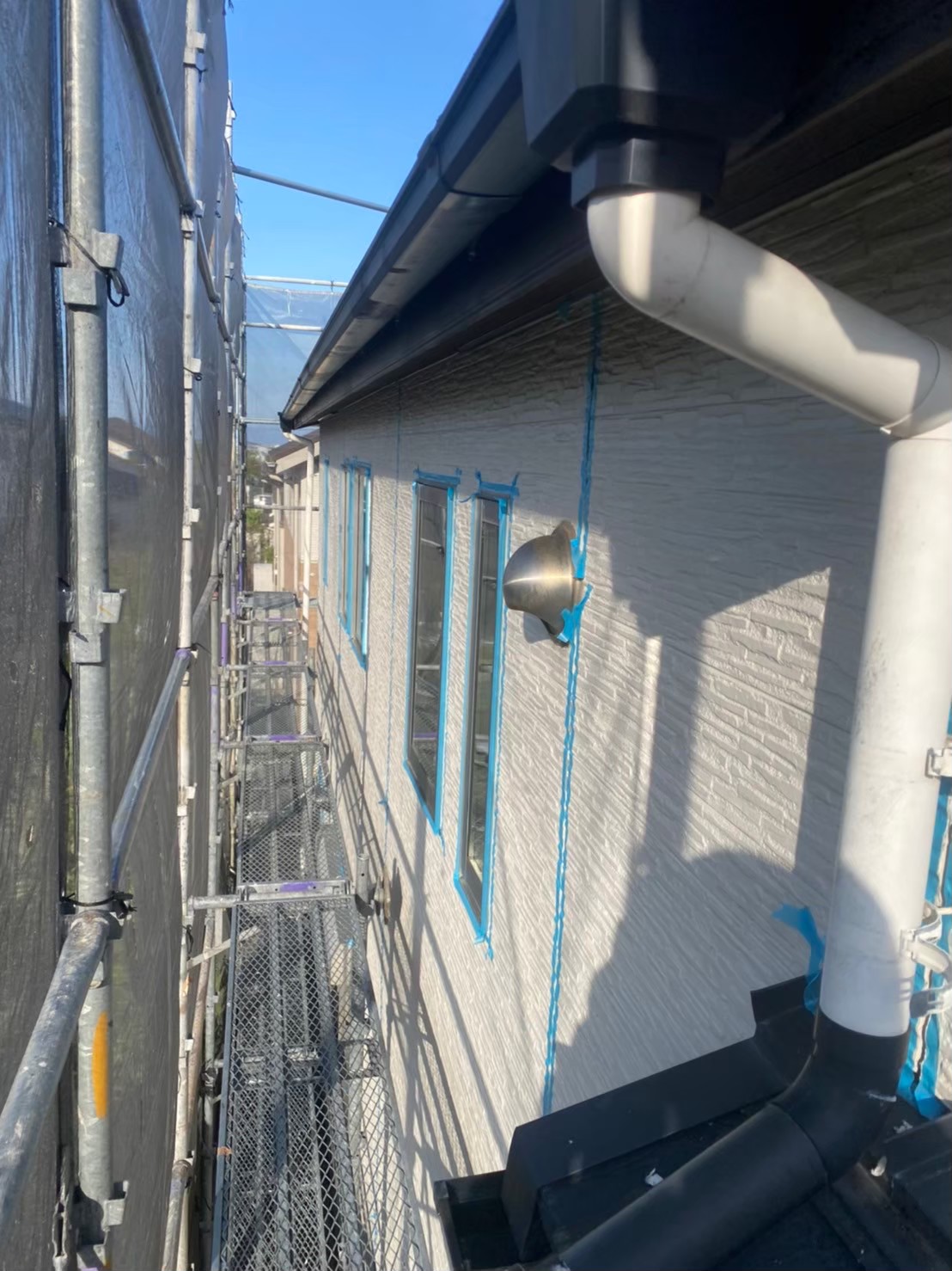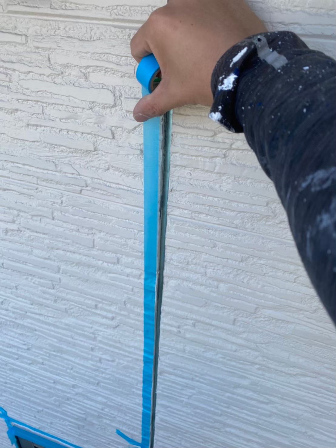 サイディングの凹凸に沿ってしっかりとテープを貼っていきます。