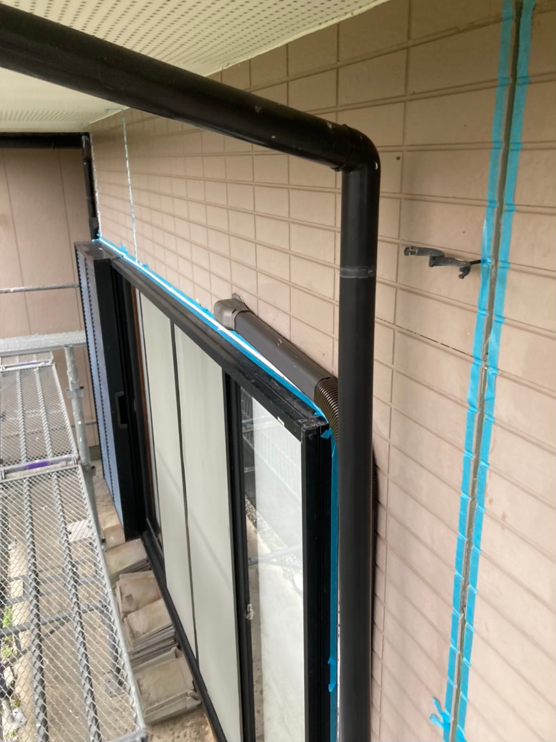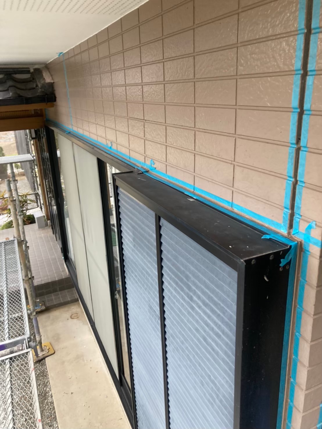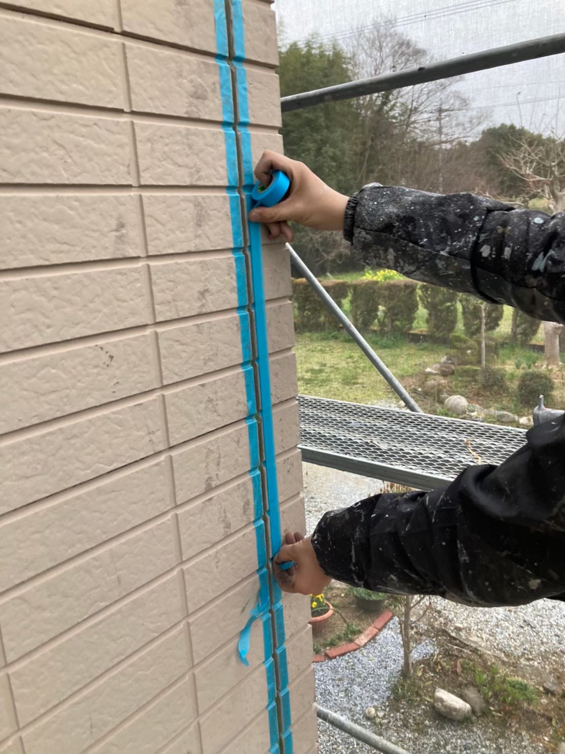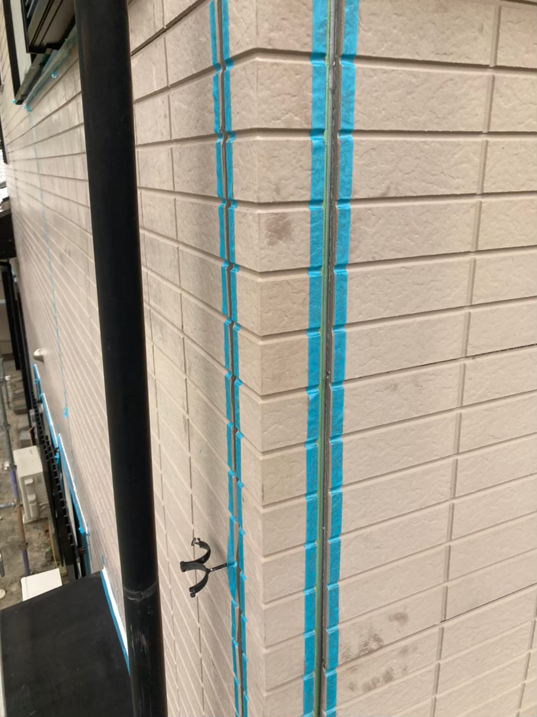 撤去が終わった後に、マスキングテープにて外壁目地、窓サッシ目地の養生作業を行っていきます。