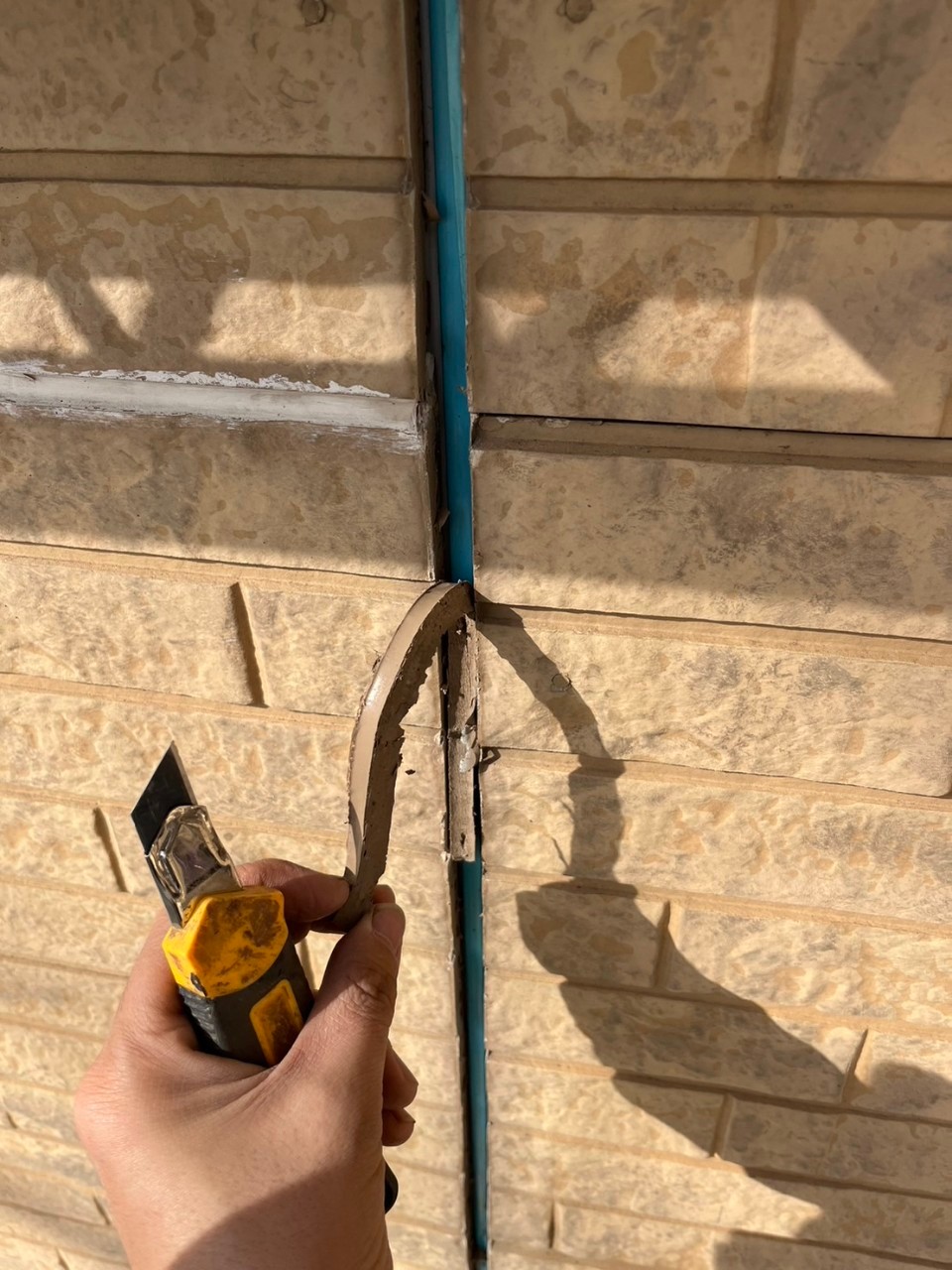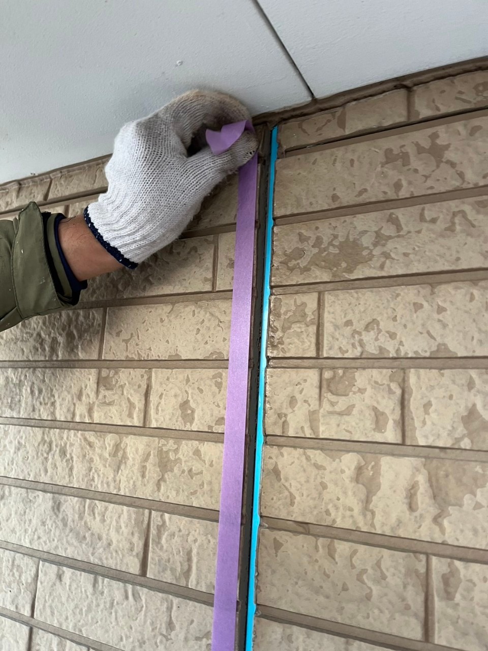 外壁目地シーリングの撤去が終わった後に、マスキングテープを使用して養生作業を行っていきます。
