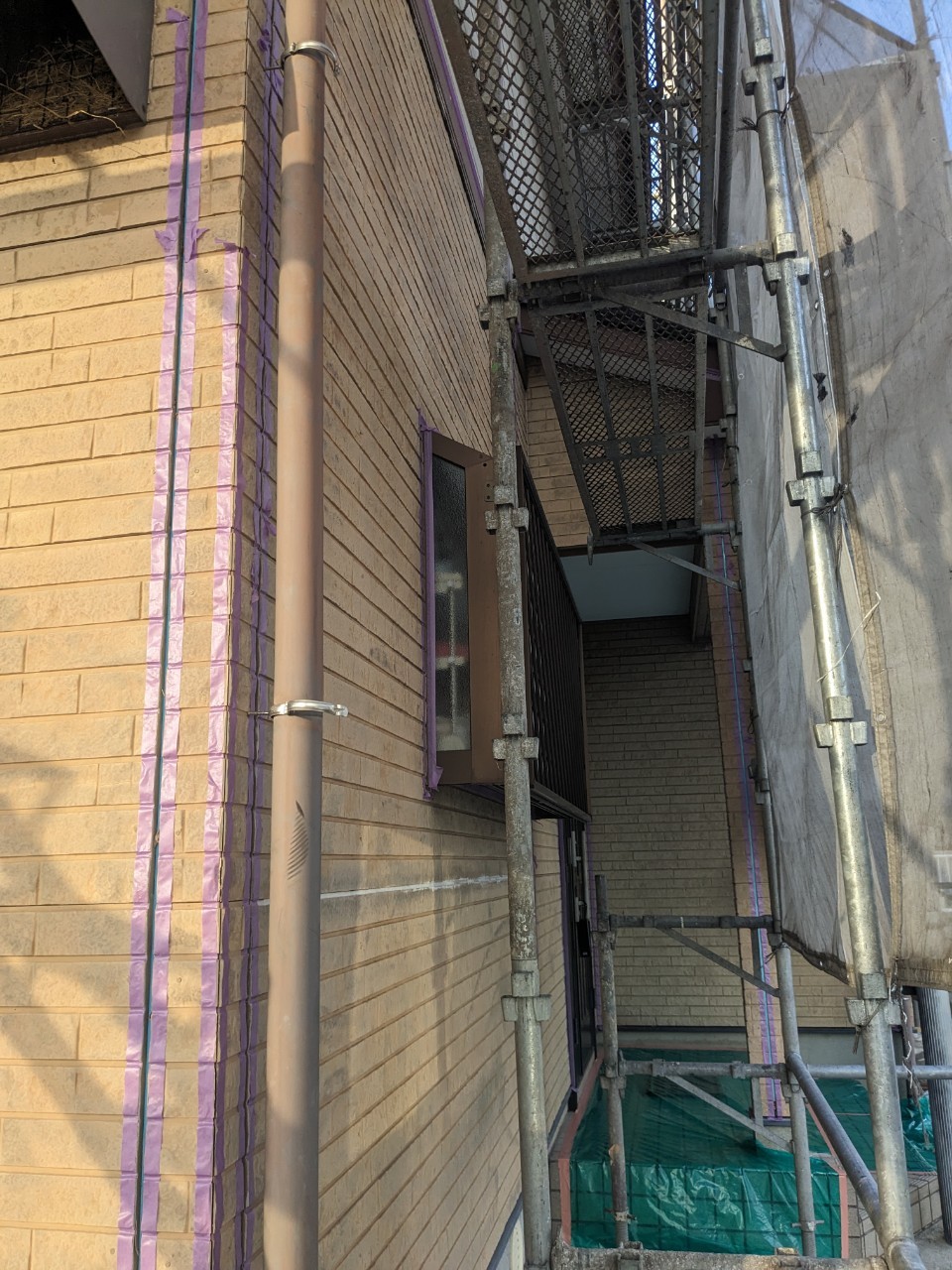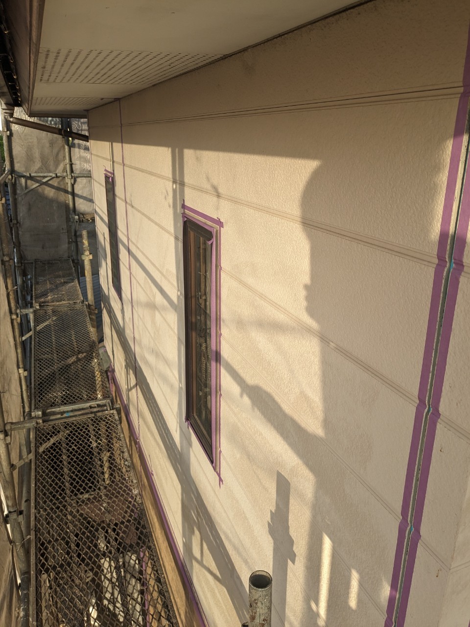 外壁の凹凸に沿ってしっかりとマスキングテープを貼っていきます。