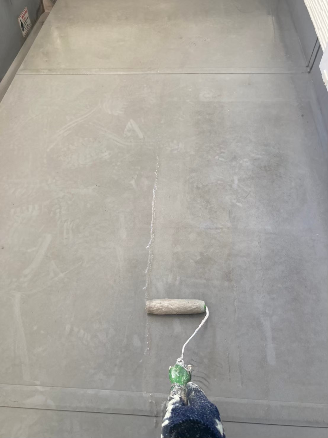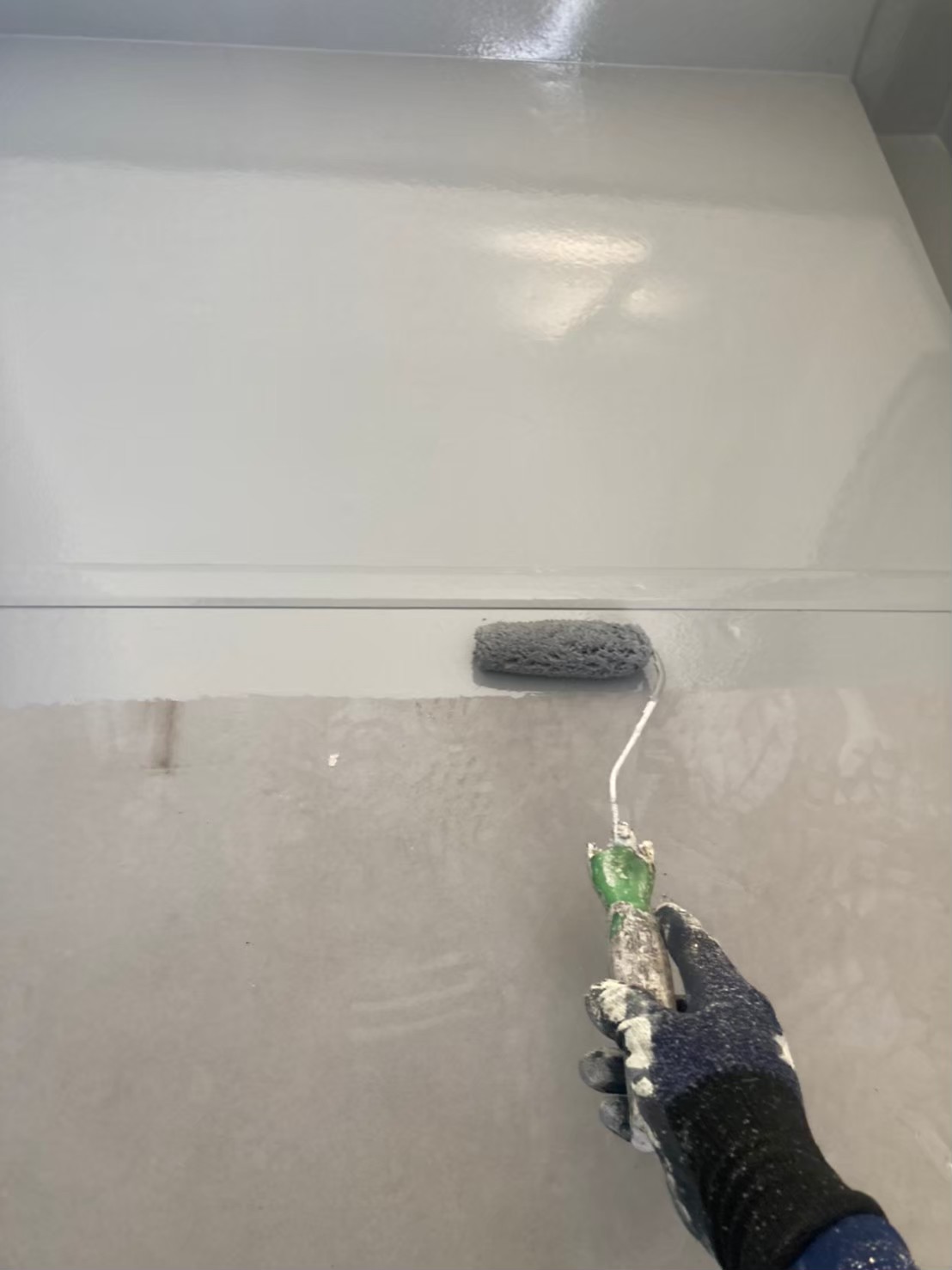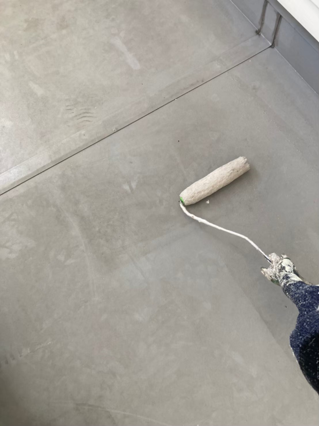 乾燥後に、日本特殊塗料 プルーフロンGRトップにて床の防水性を保つ為に塗布を行っていきます。