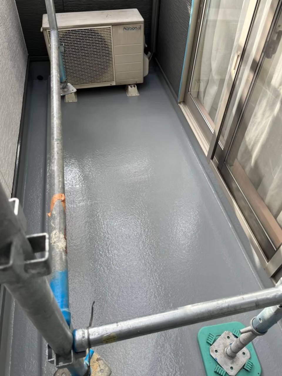 本日はバルコニー床のトップコート、門柱の塗装の様子をお伝えいたします。