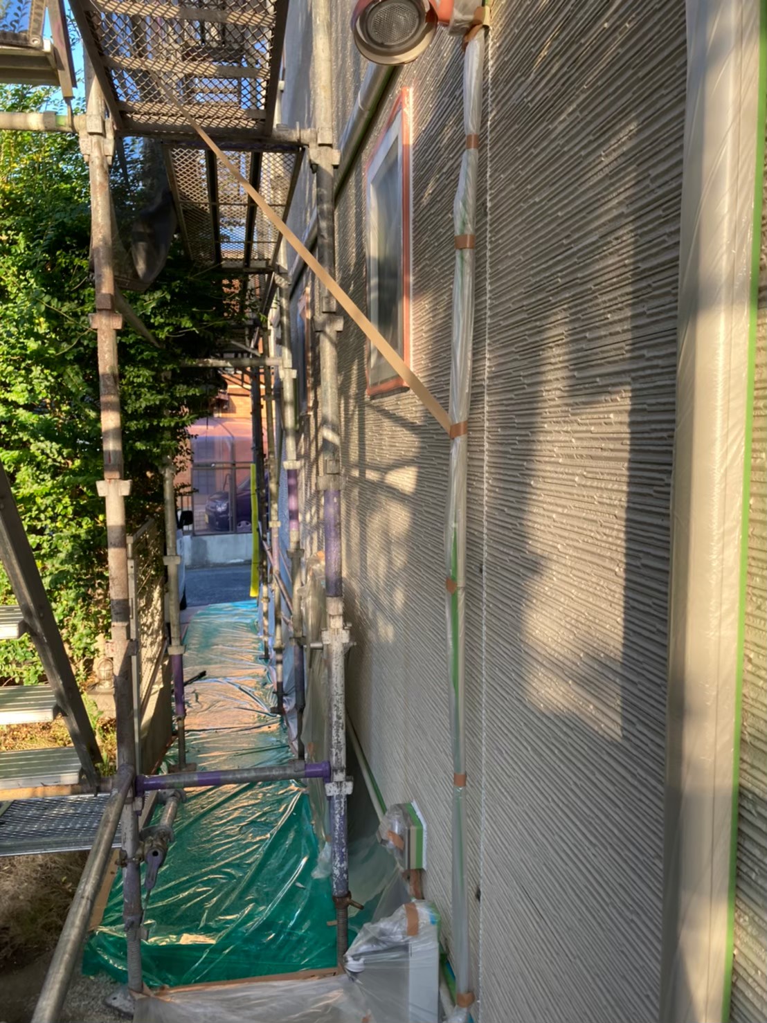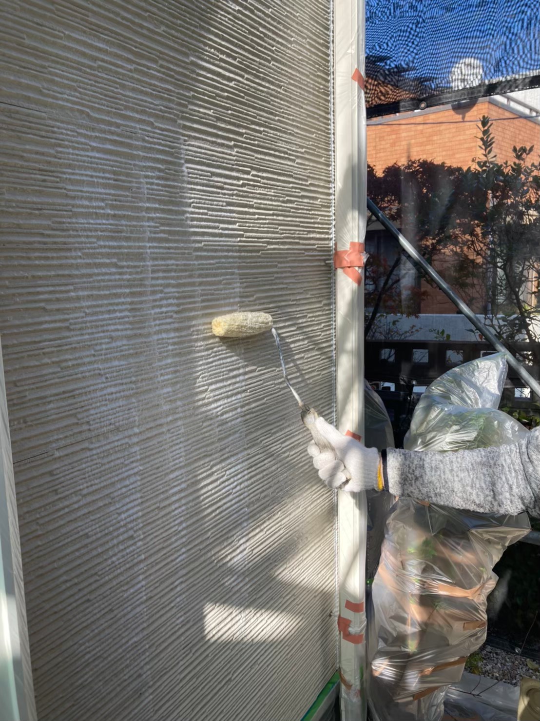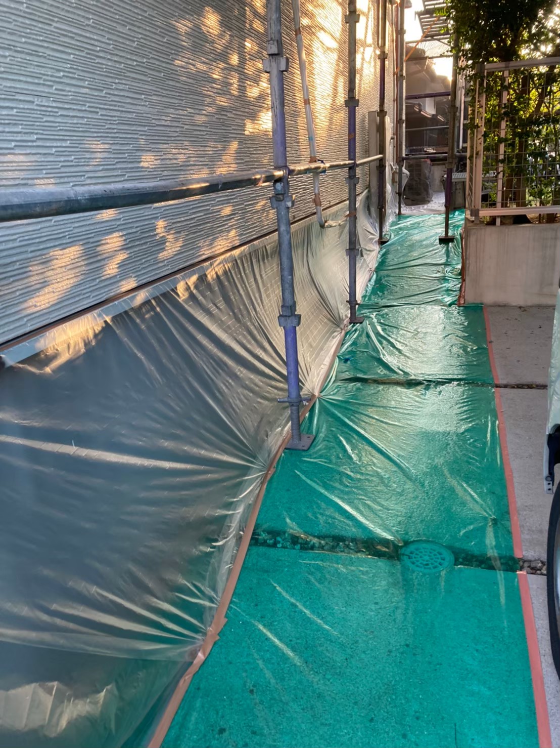 本日は養生作業、外壁の下塗りの様子をお伝えいたします。