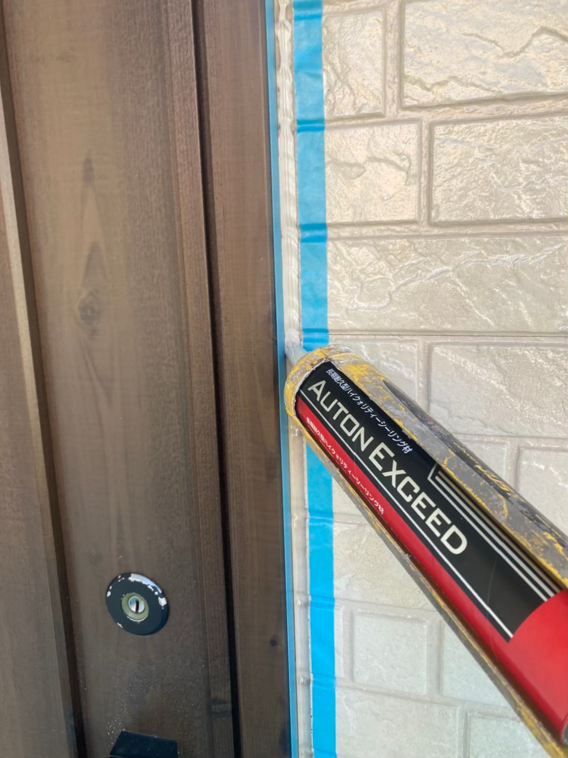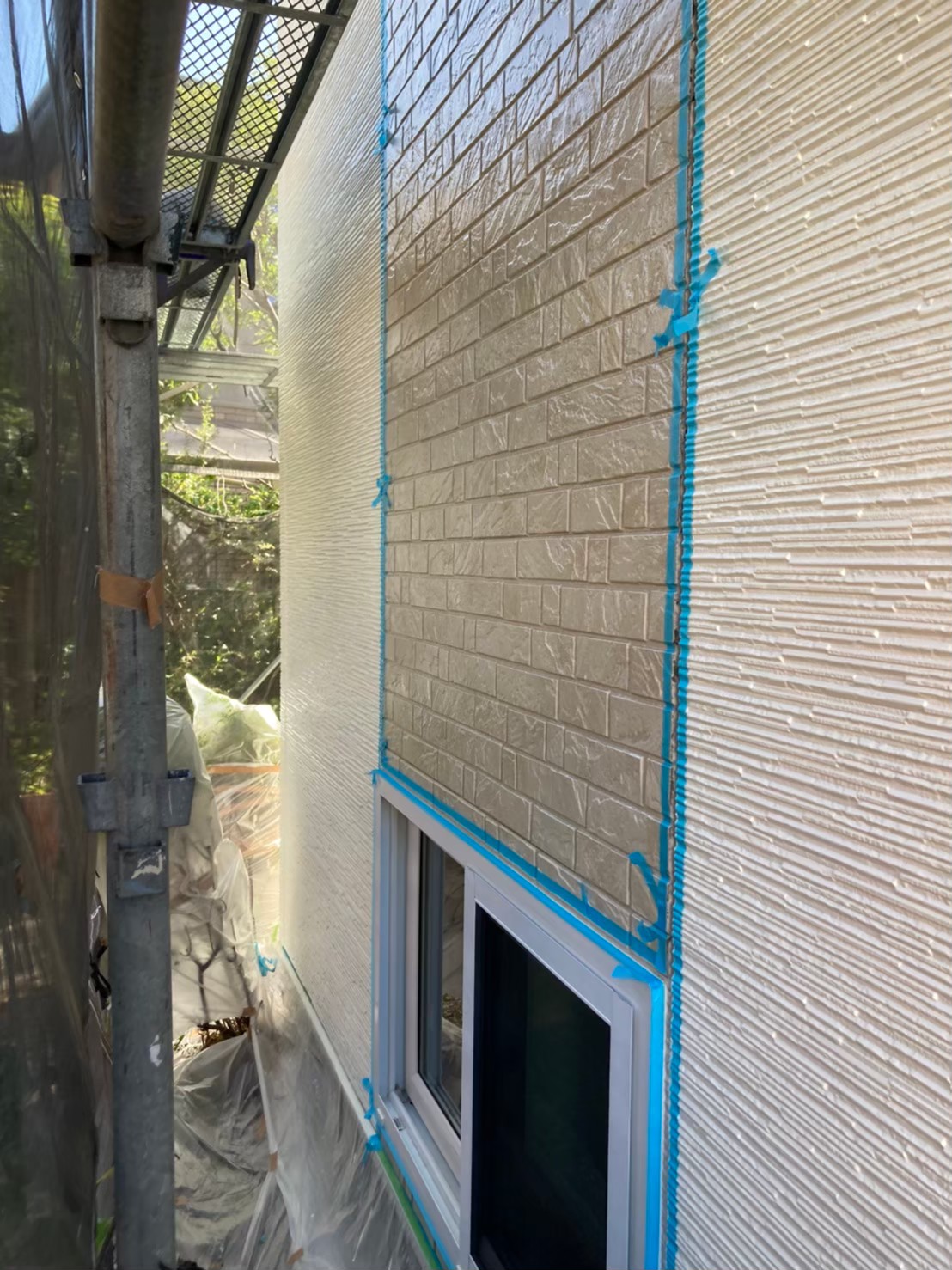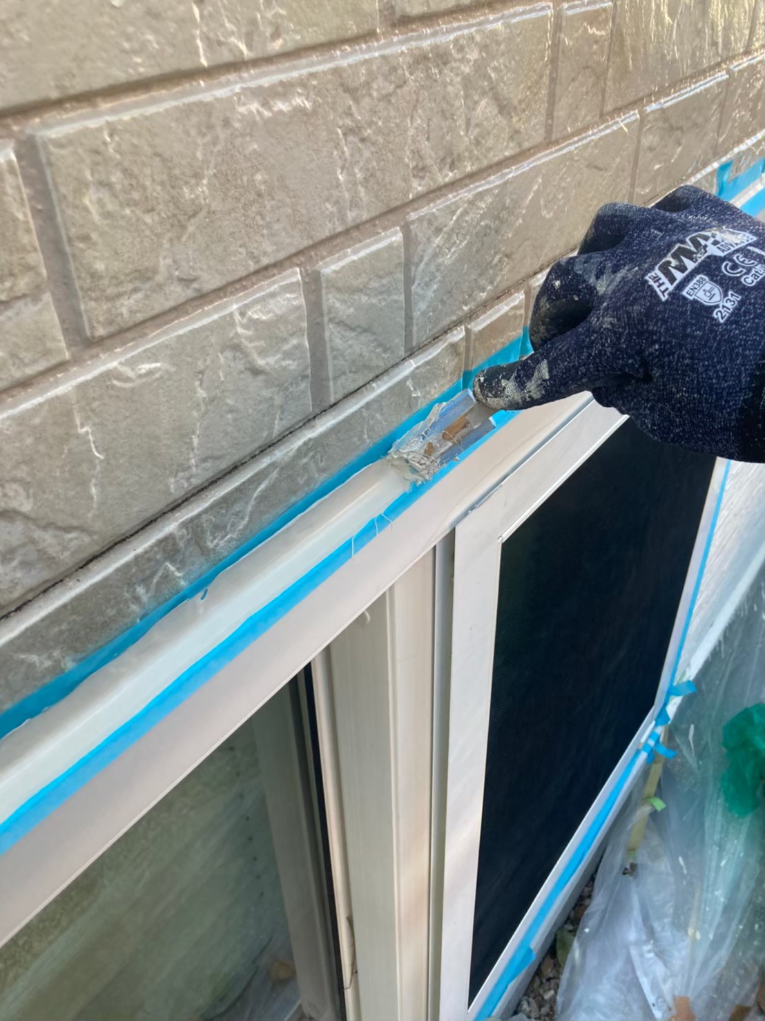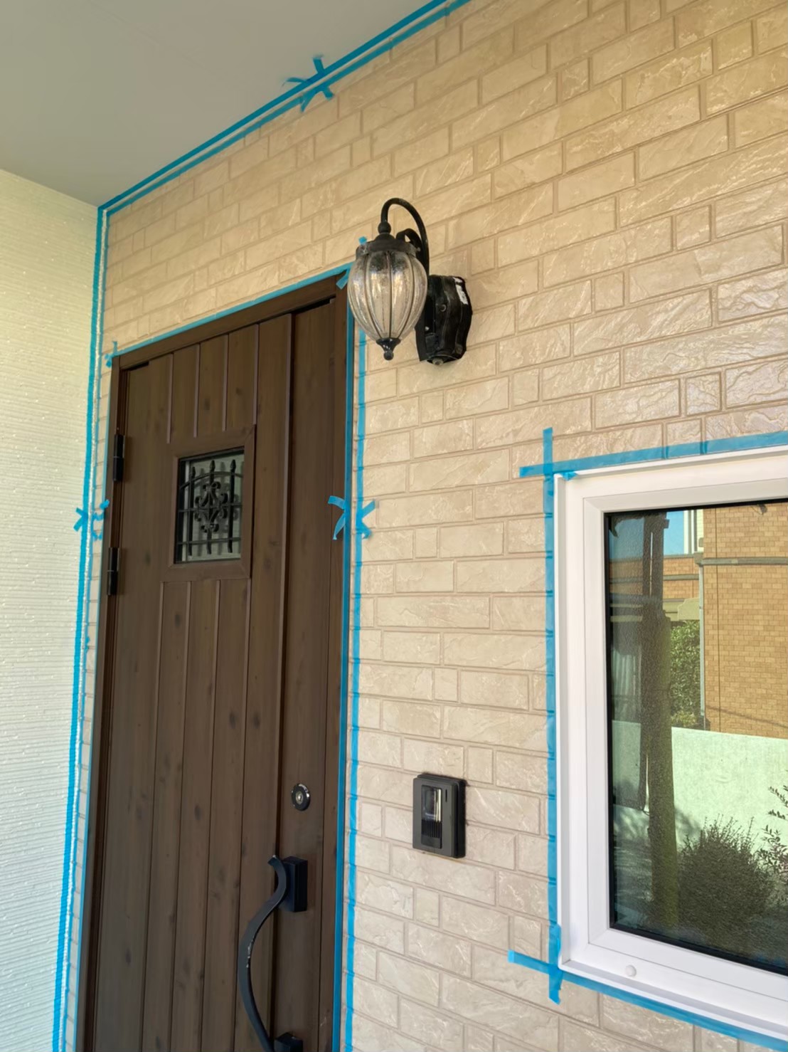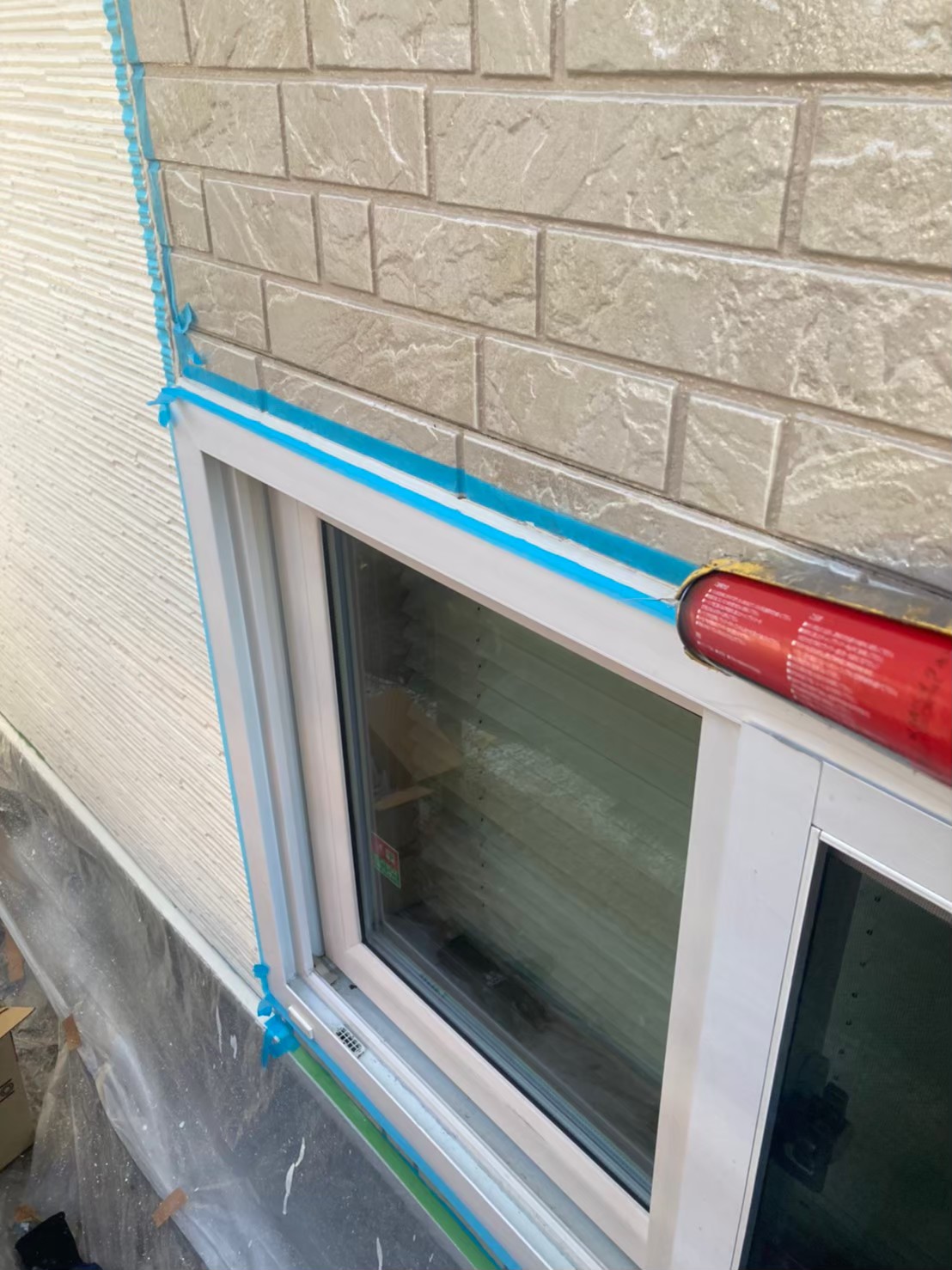 まずは、マスキングテープを使用し打ち替えに伴う養生作業を行っていきます。