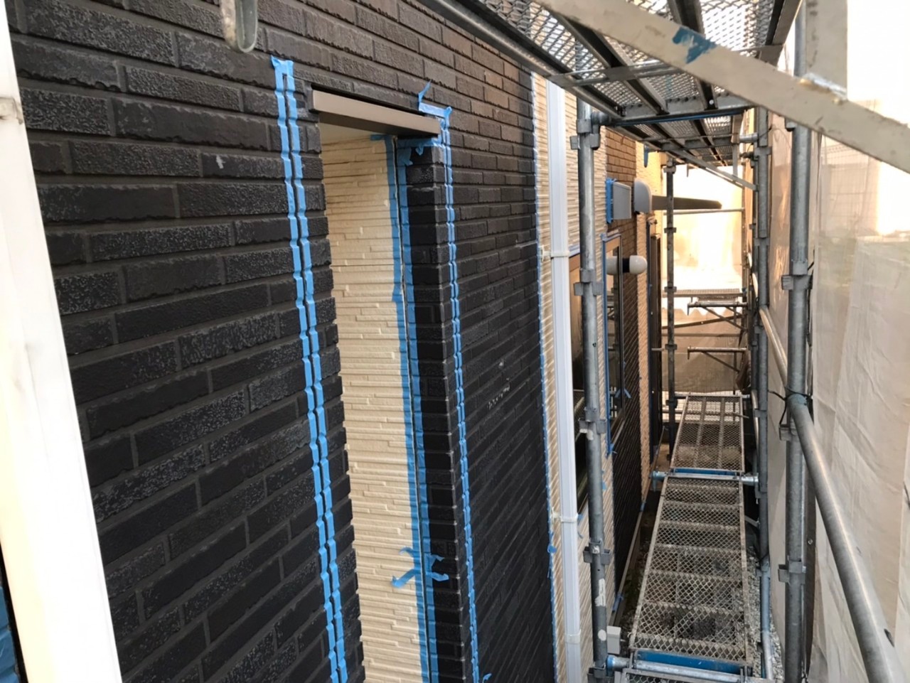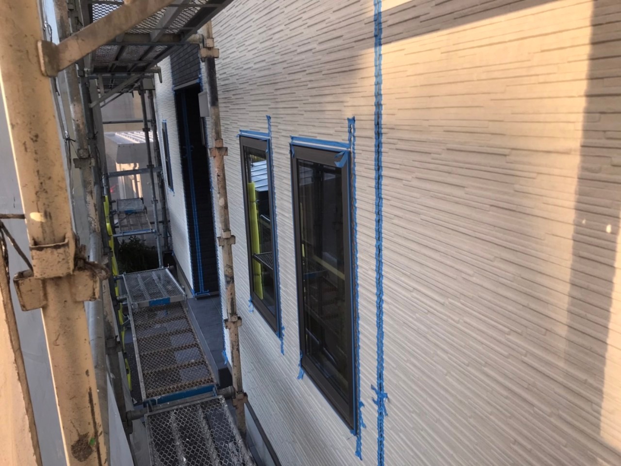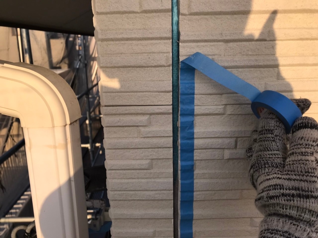 シーリングを打ち替える際に綺麗なラインが出る様に、しっかりと押さえながらマスキングテープを貼っていきます。