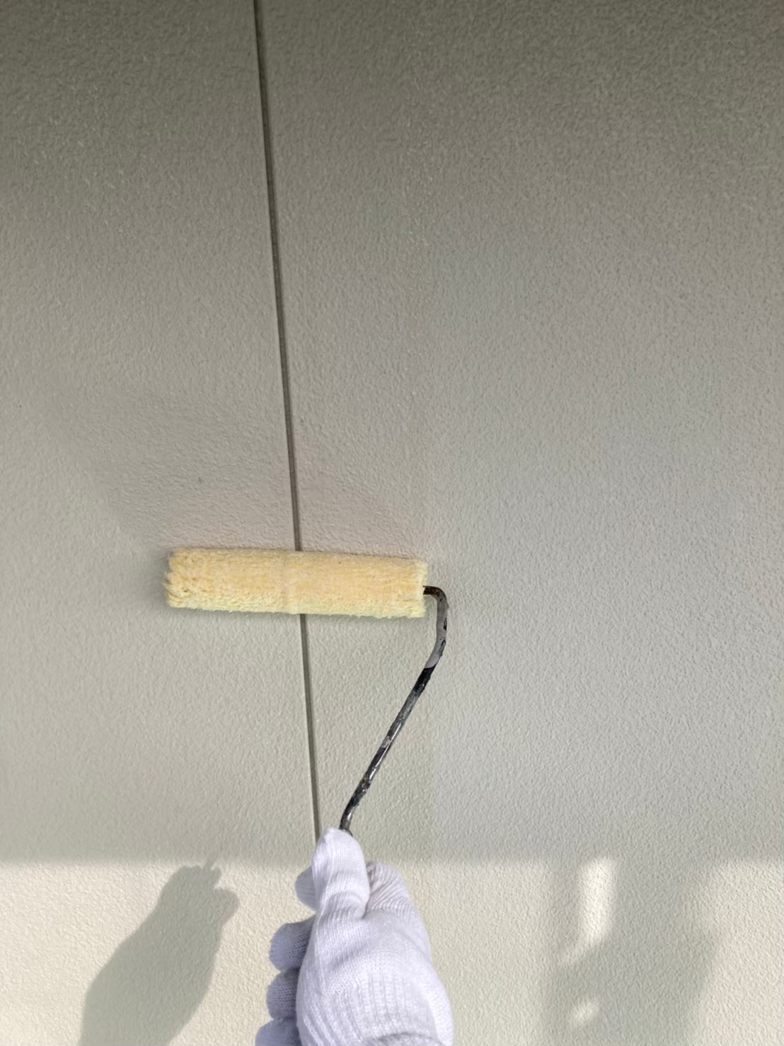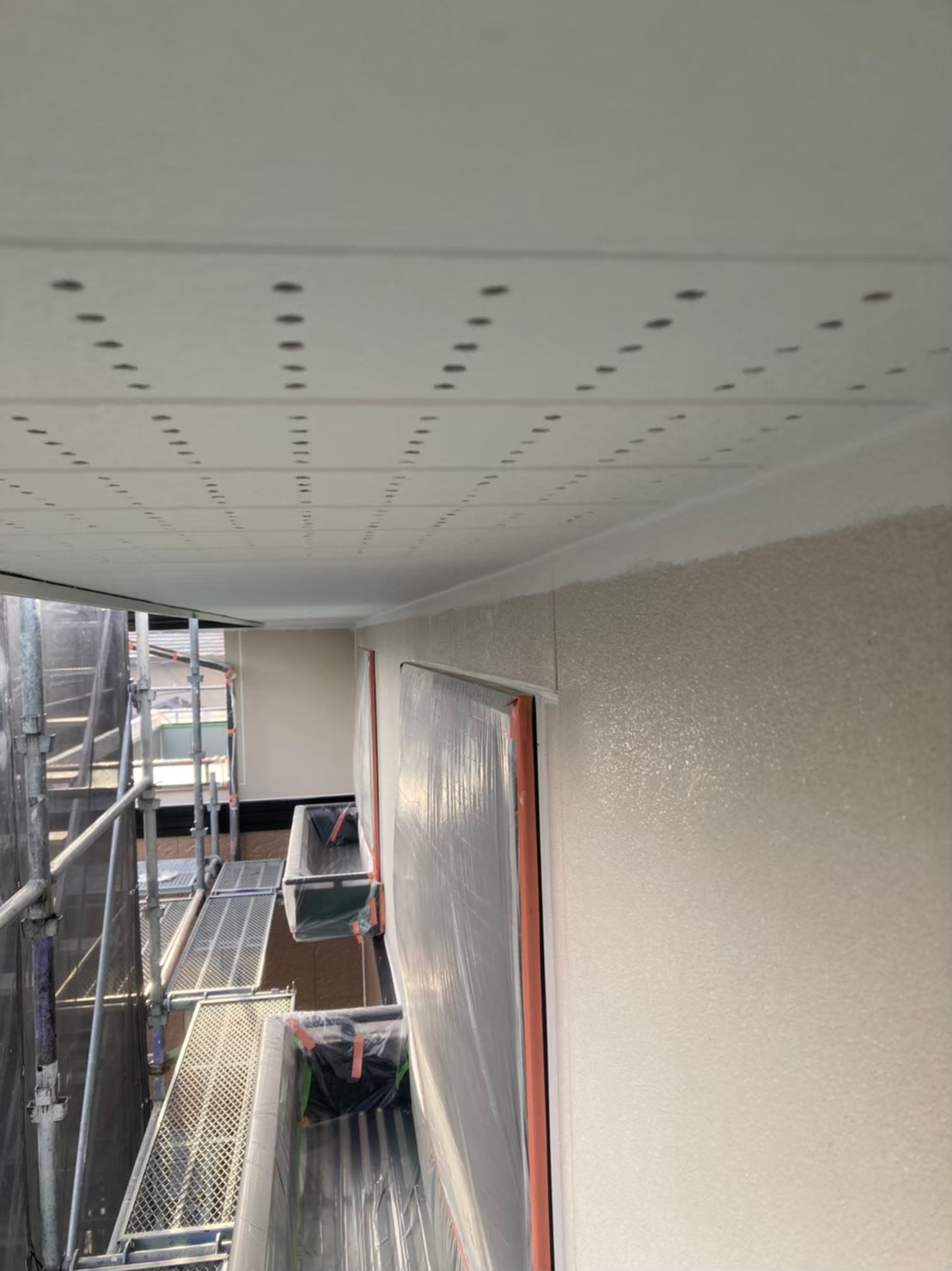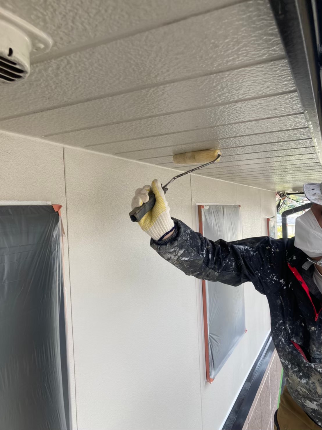 本日は外壁の下塗り、軒天井塗装の様子をお伝えいたします。