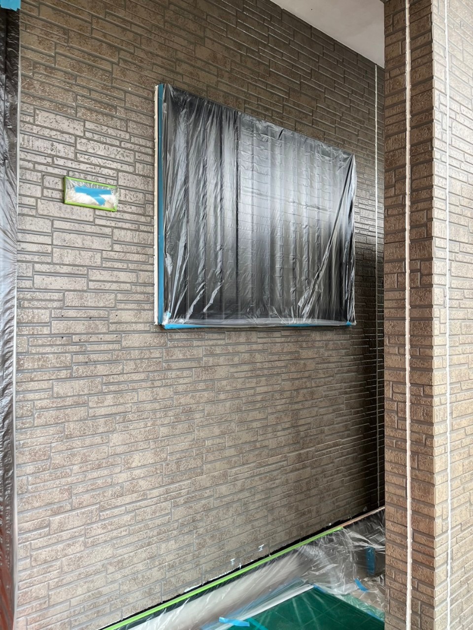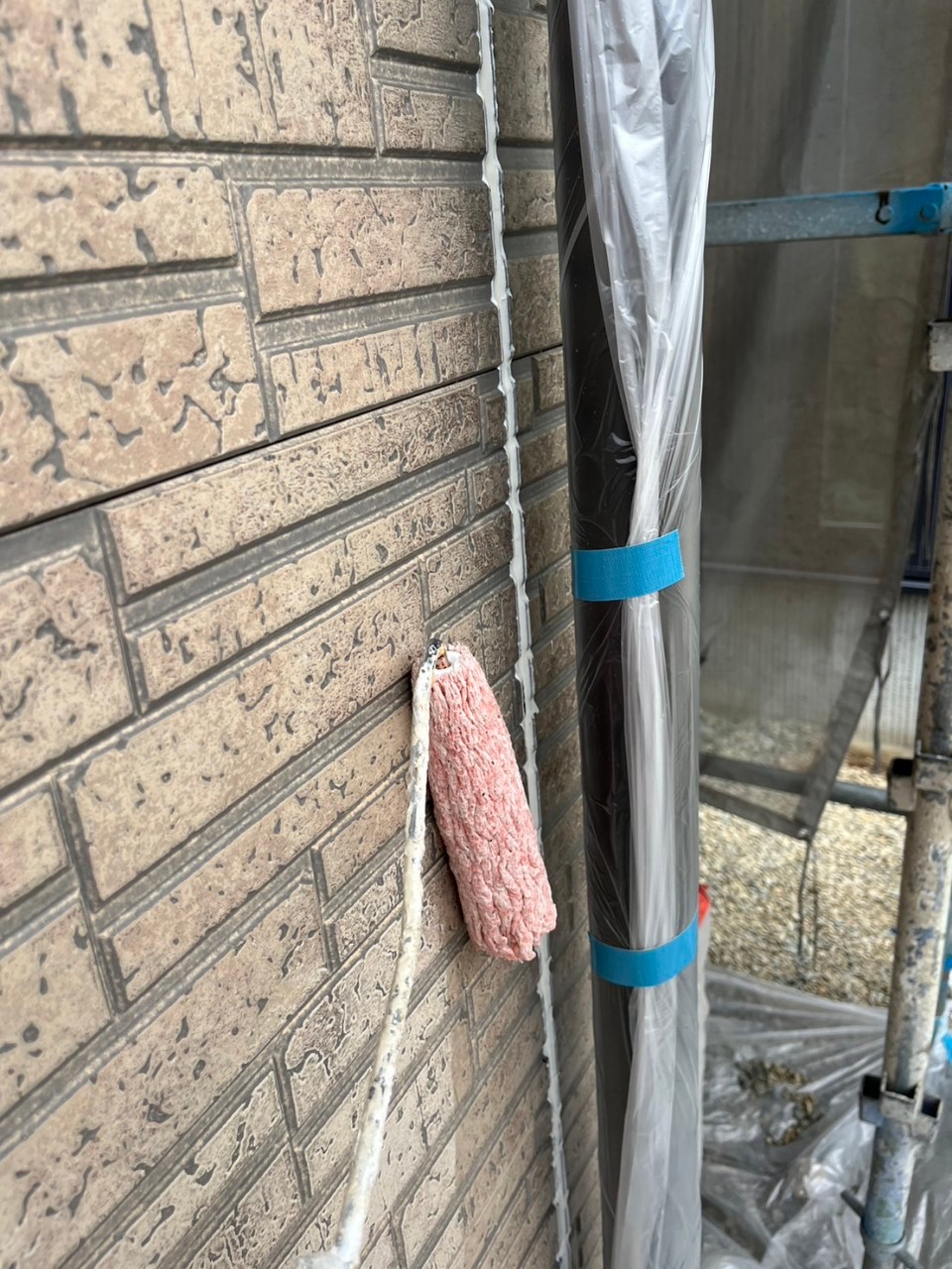 外壁と塗料の接着剤的な役割りを果たし、今回はクリヤー色での下塗りを行いました。