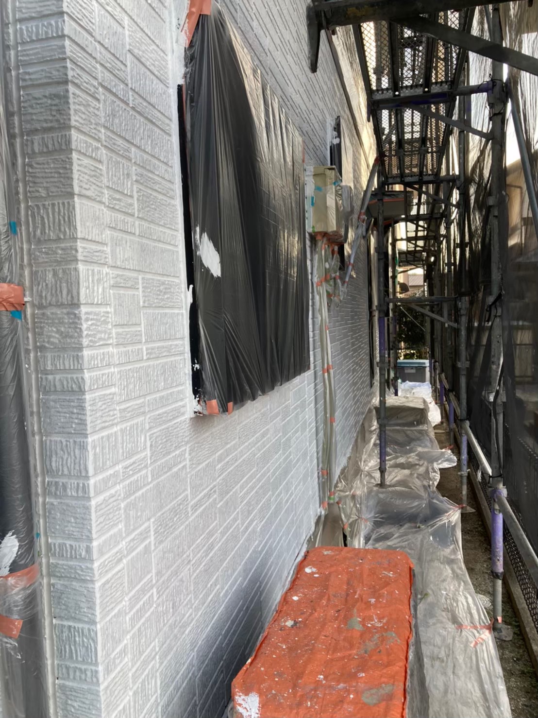 本日は外壁の下塗り、軒天井塗装の様子をお伝えいたします。