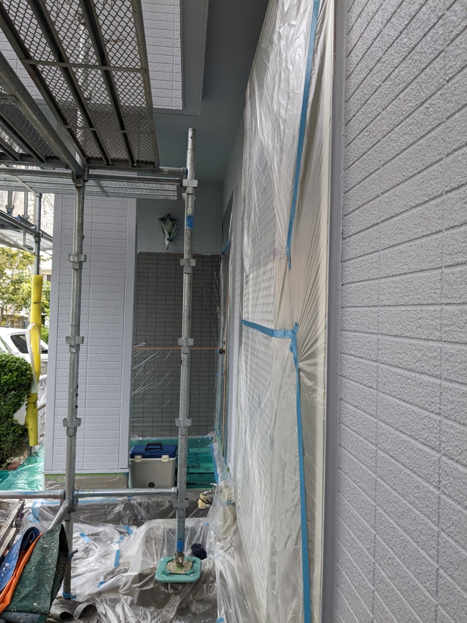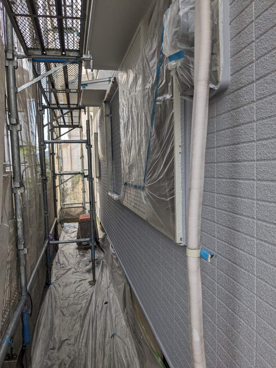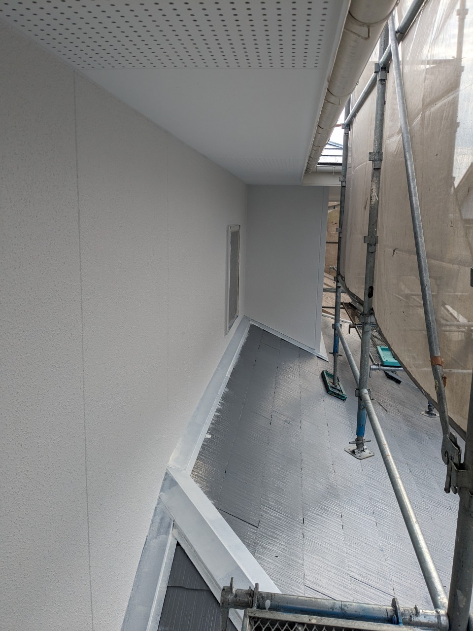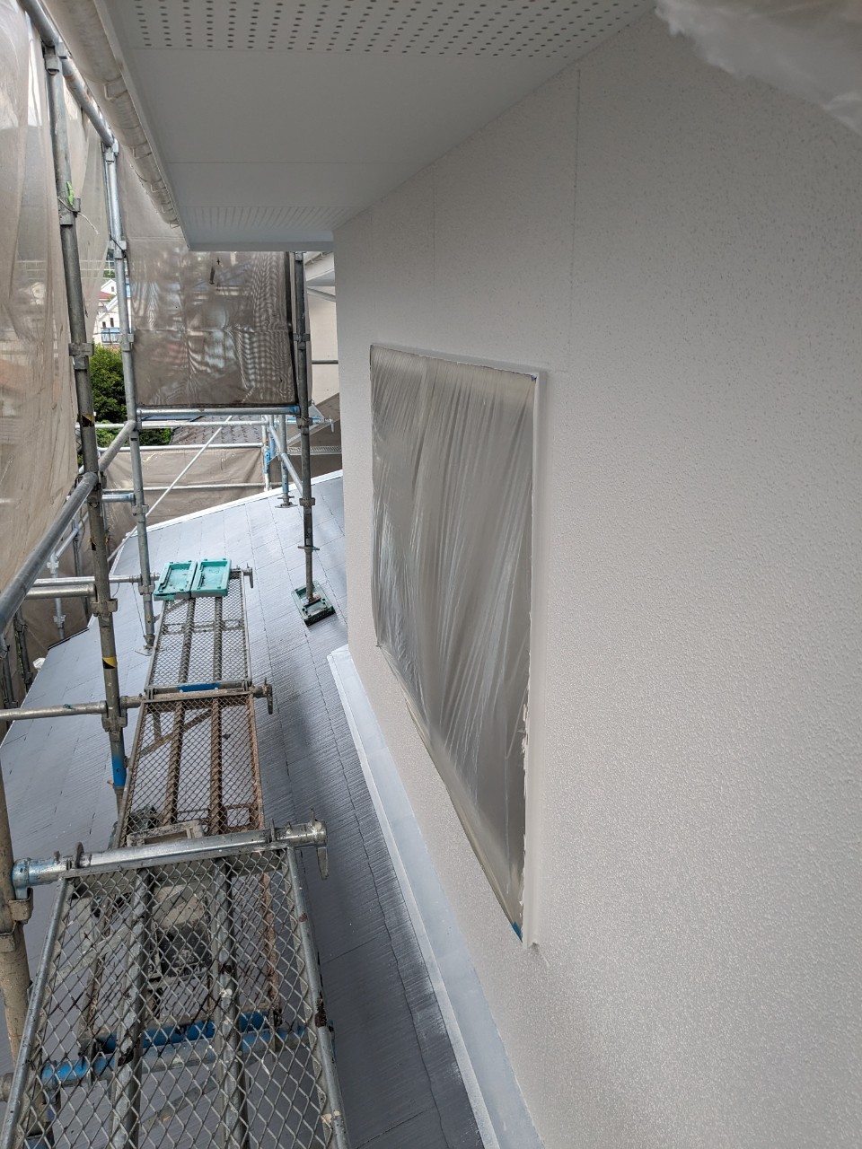 明日は屋根のタスペーサー処理、外壁の上塗りを行います。