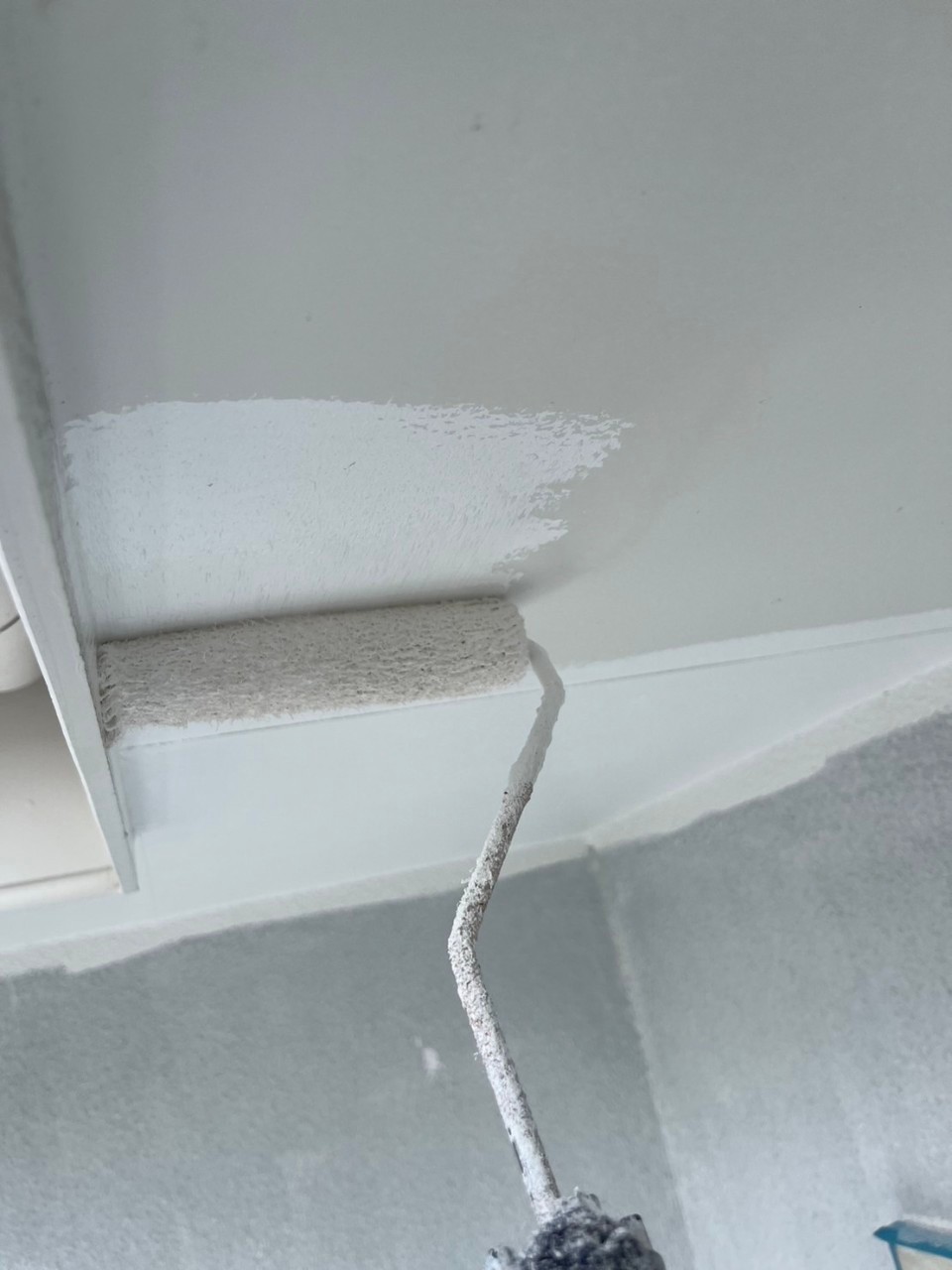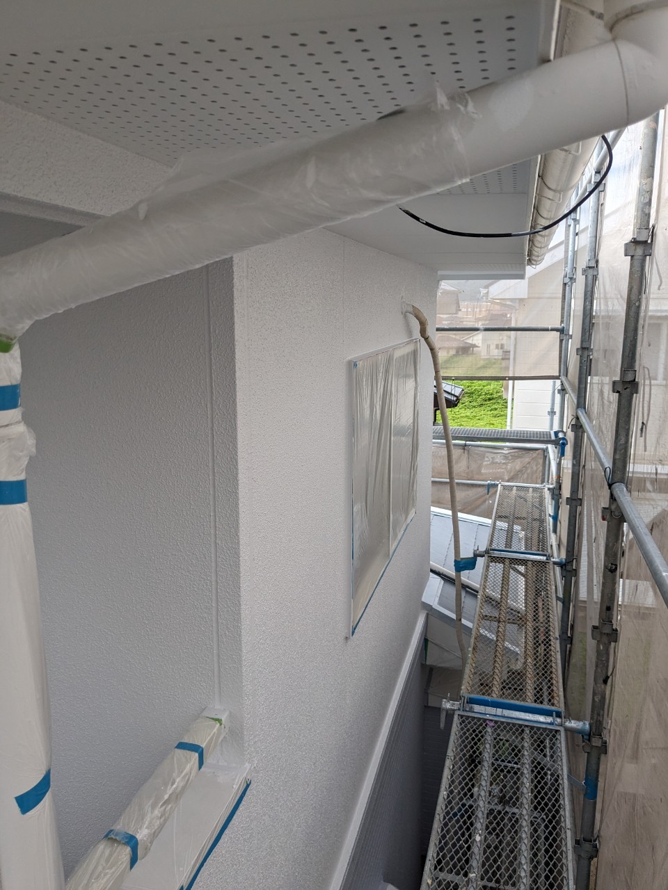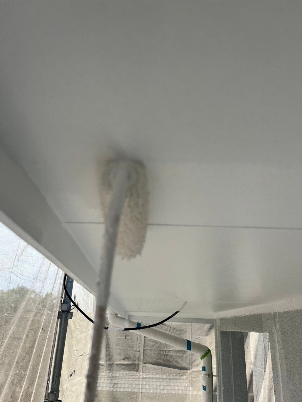 本日は軒天井塗装、外壁の中塗りの様子をお伝えいたします。