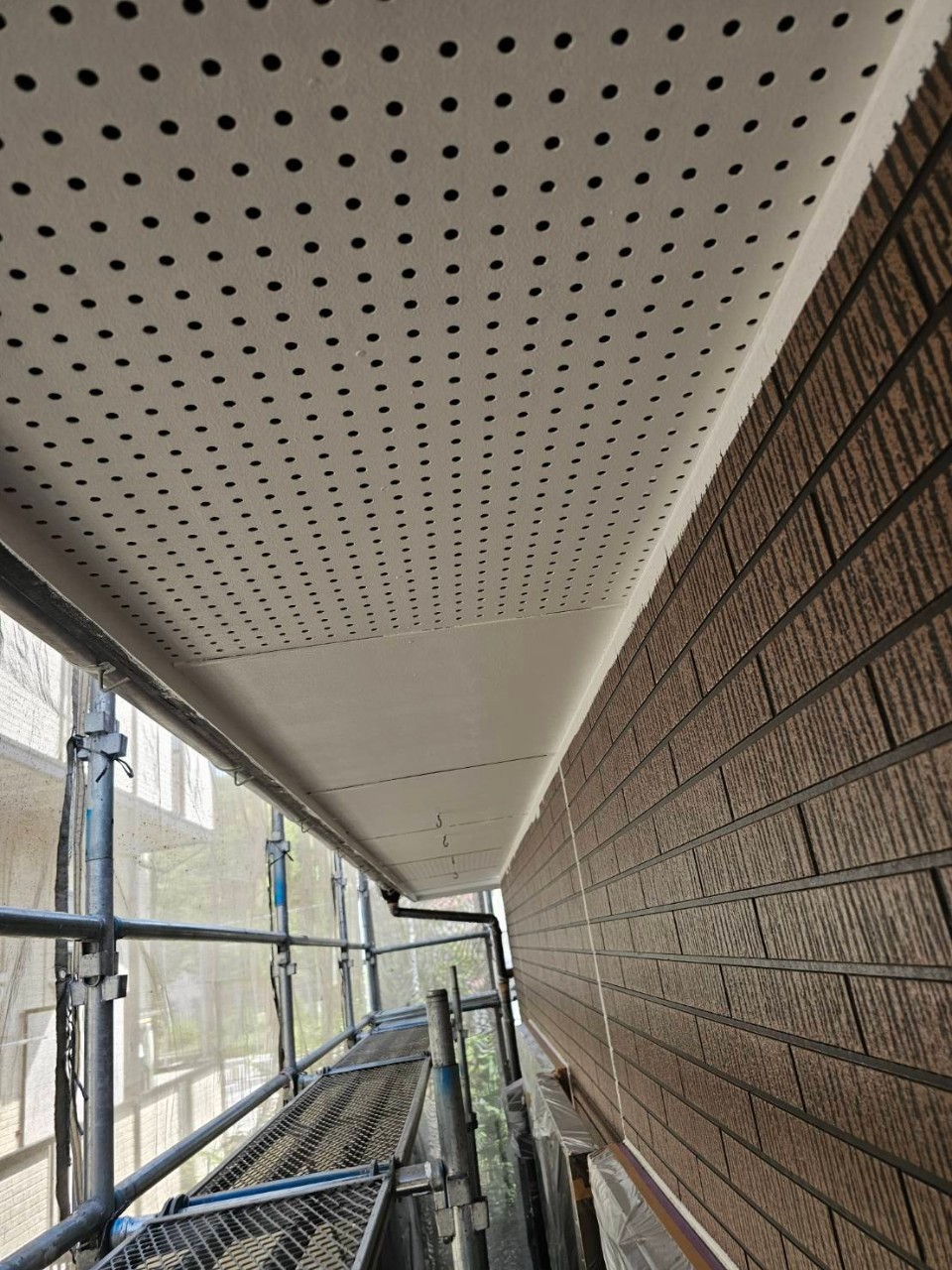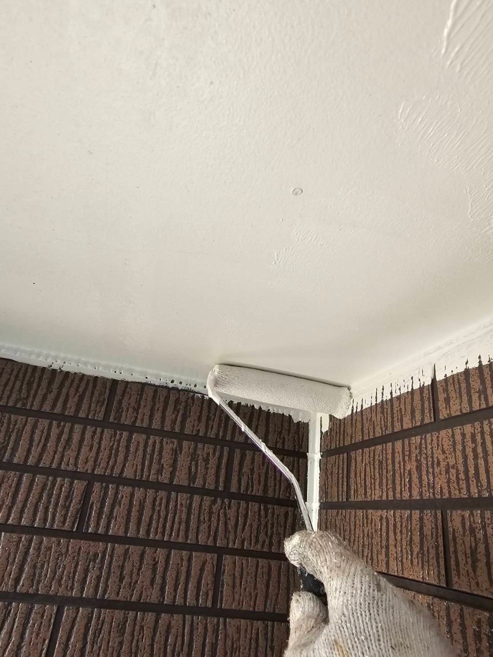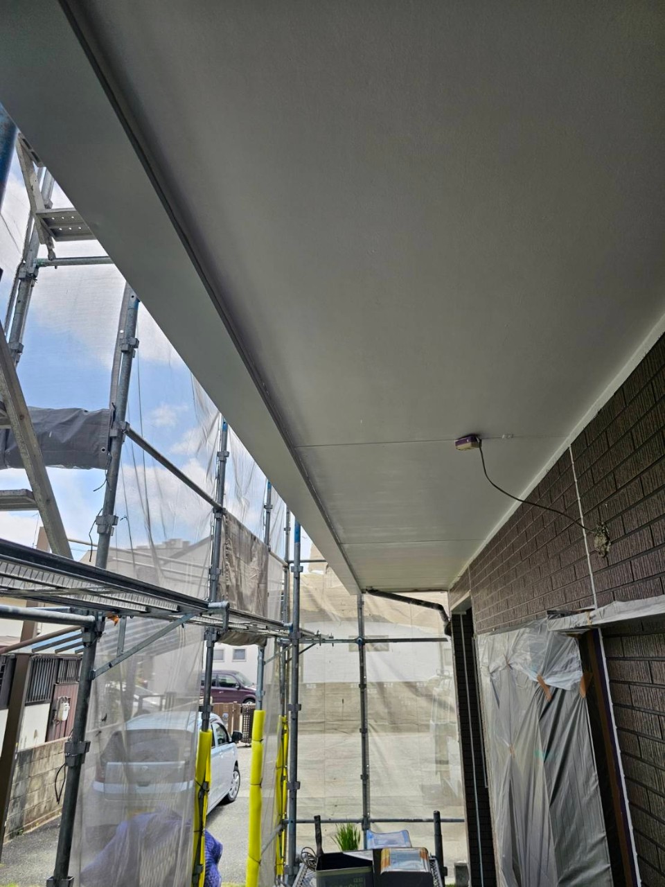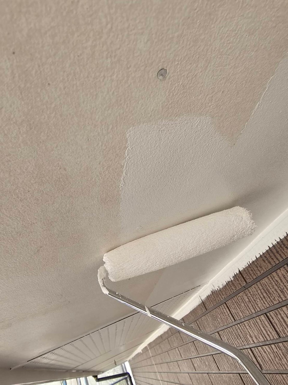 本日は屋根の下塗り、タスペーサー処理、軒天井塗装の様子をお伝えいたします。