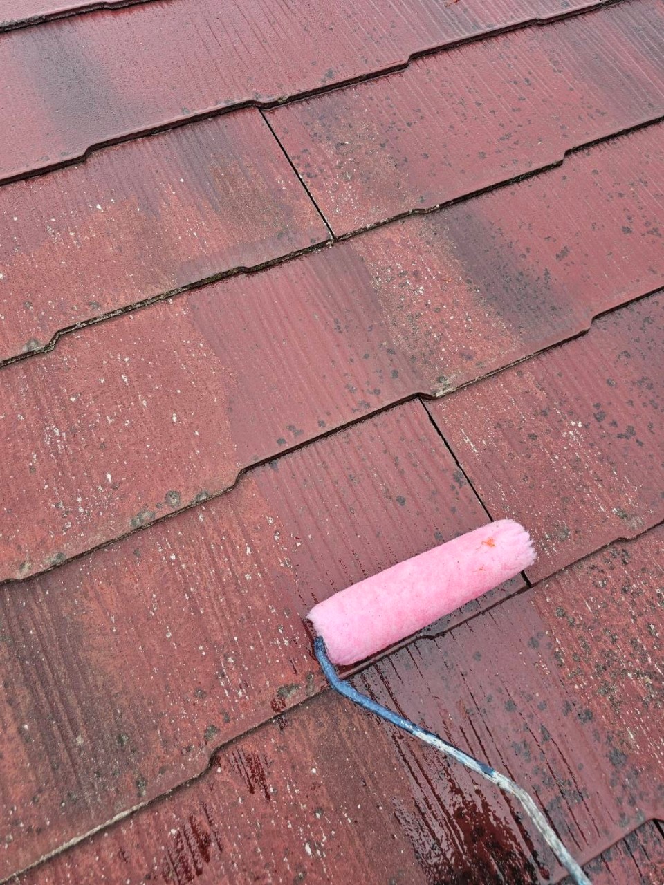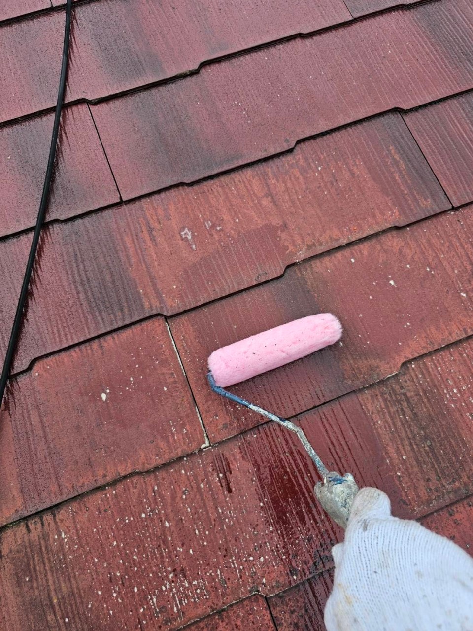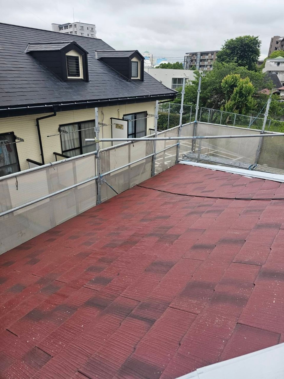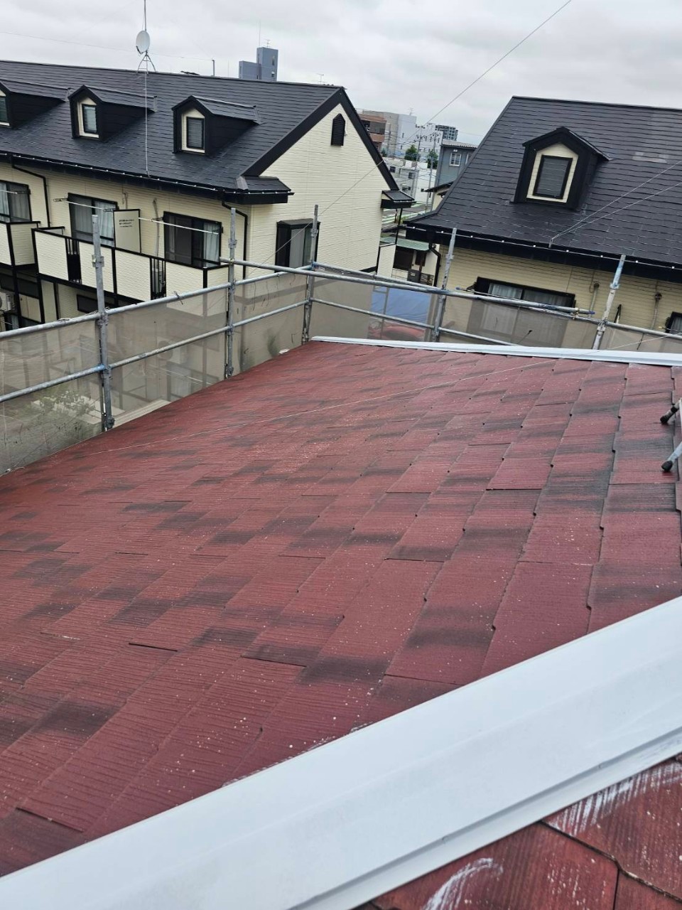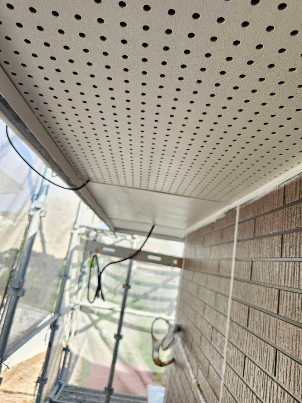 本日は屋根の下塗り、タスペーサー処理、軒天井塗装の様子をお伝えいたします。