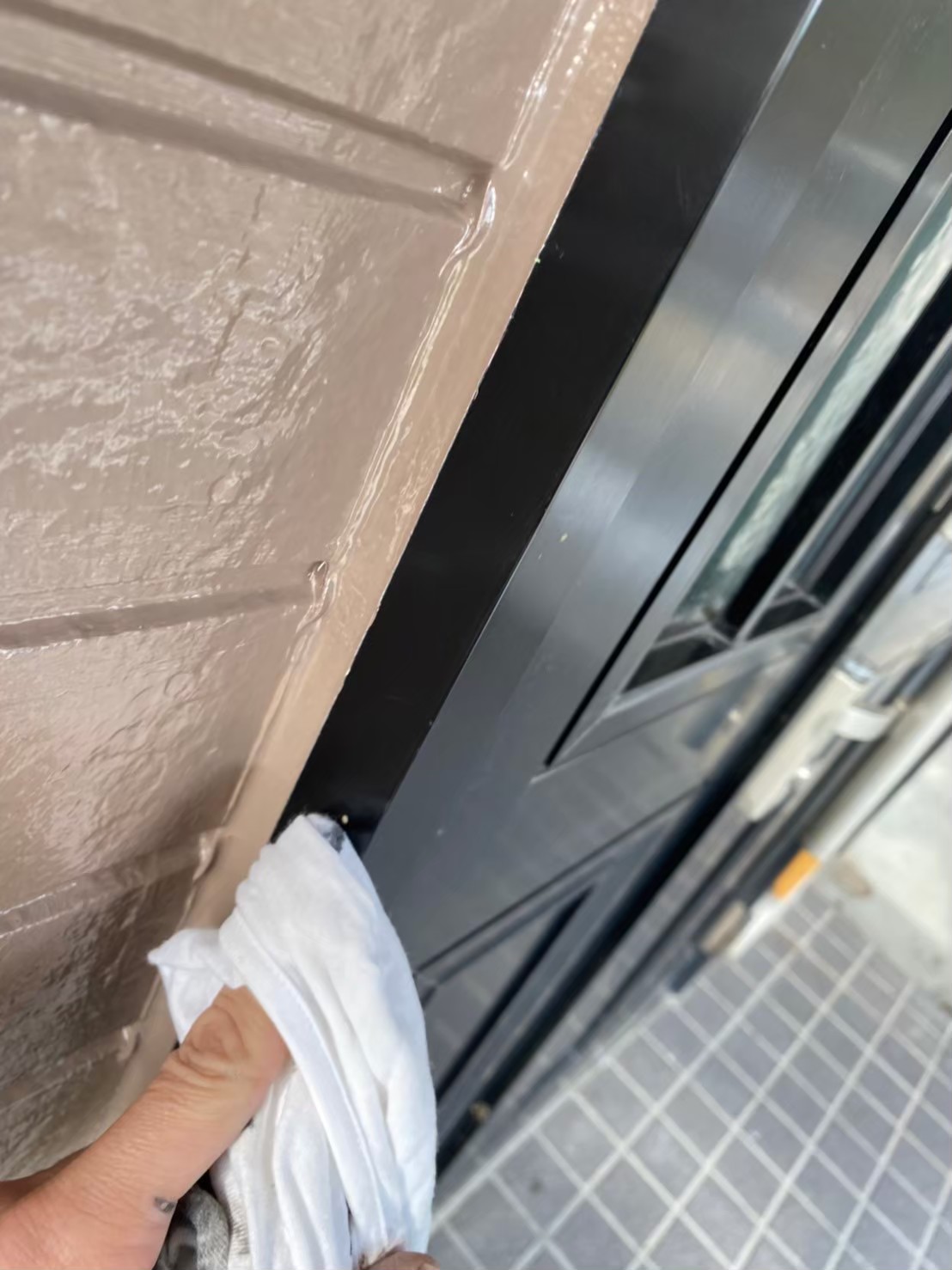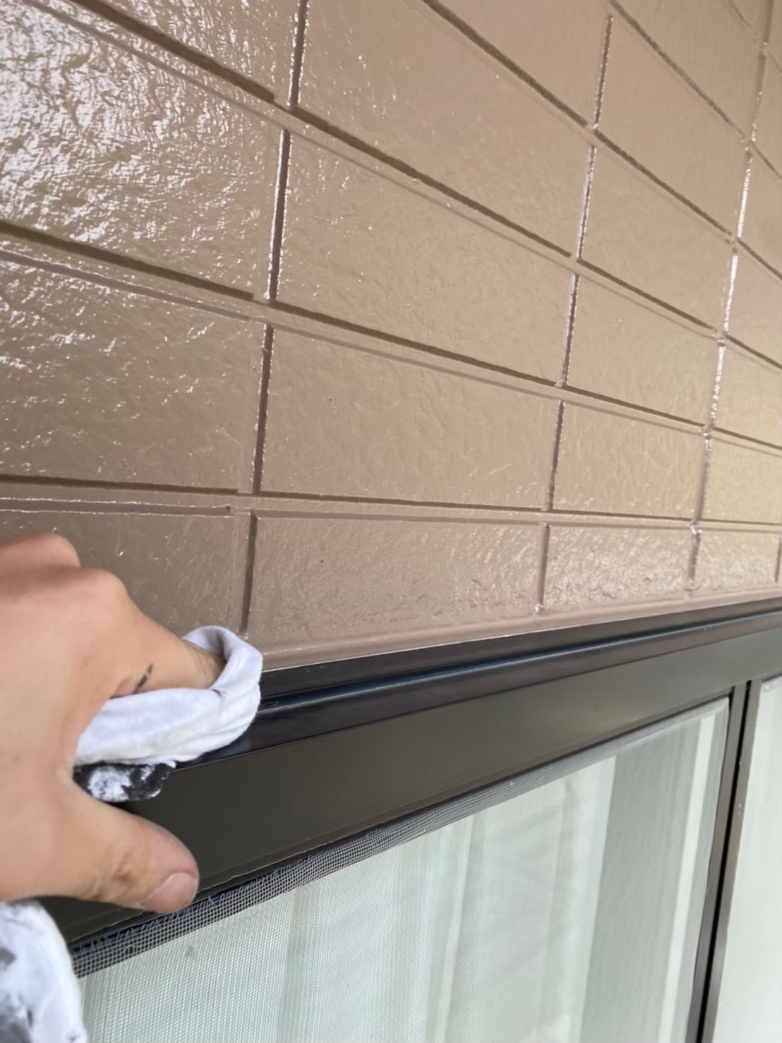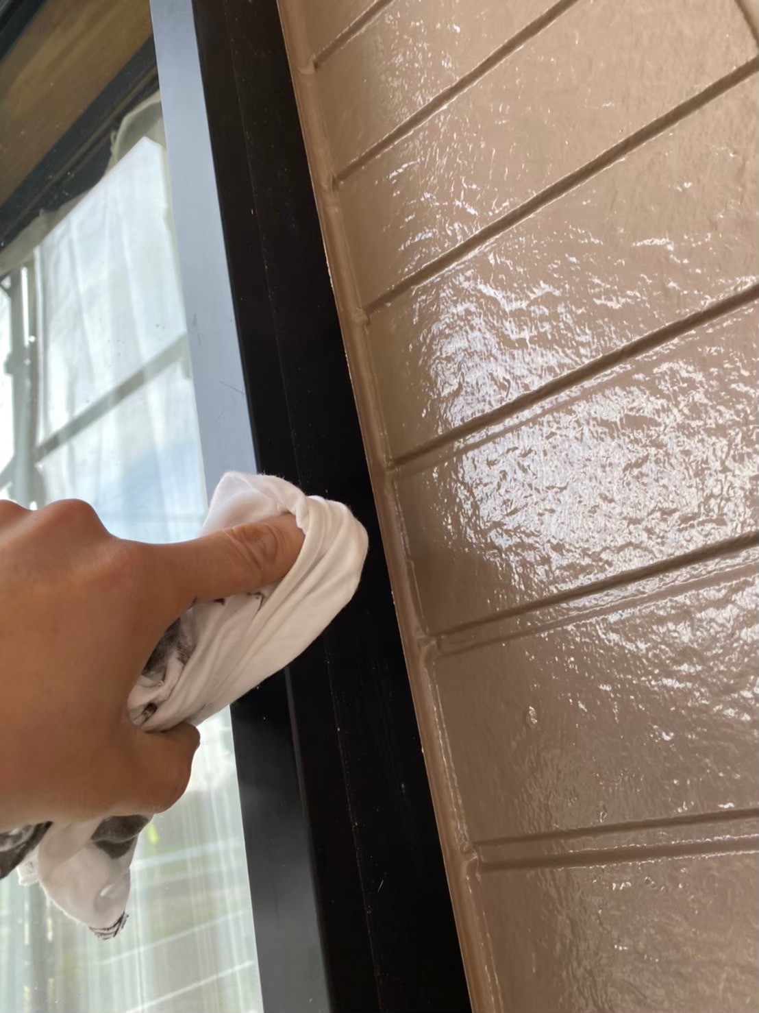 窓サッシに漏れ込んでしまった塗料をシンナーをしようして拭き取っていきます。