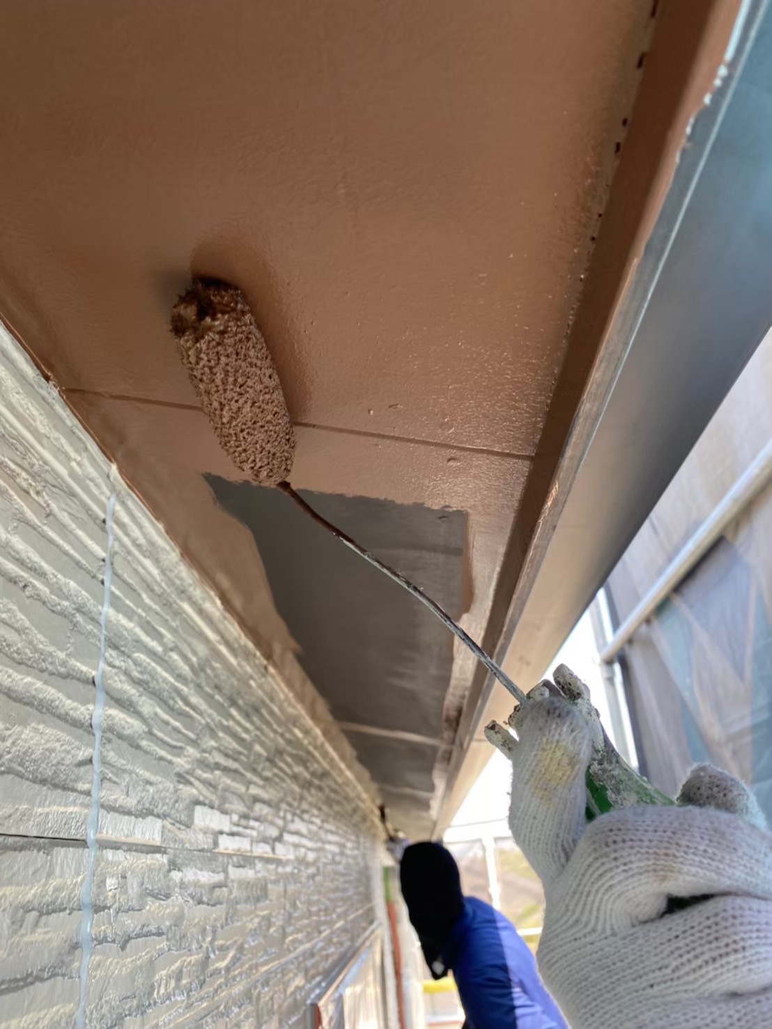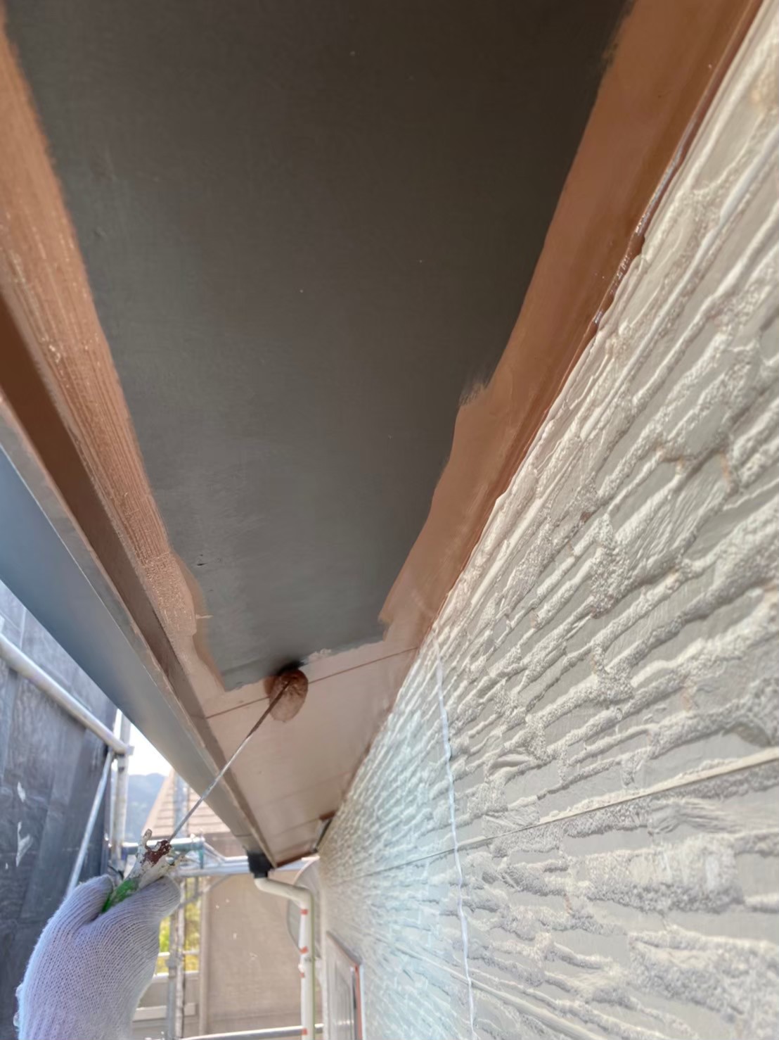 日本ペイント 水性ケンエース類似色にて軒天井の塗装を行って行きます。