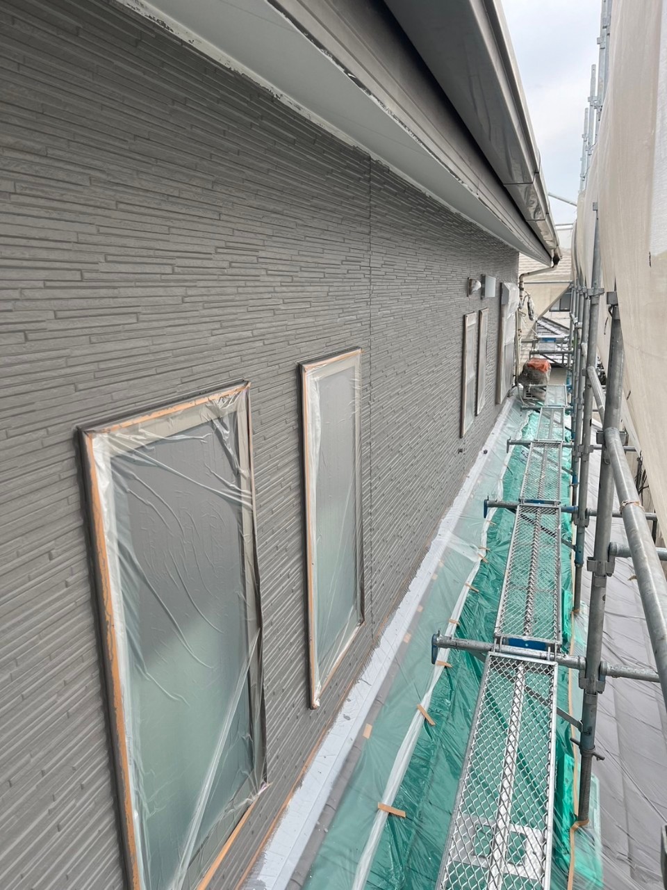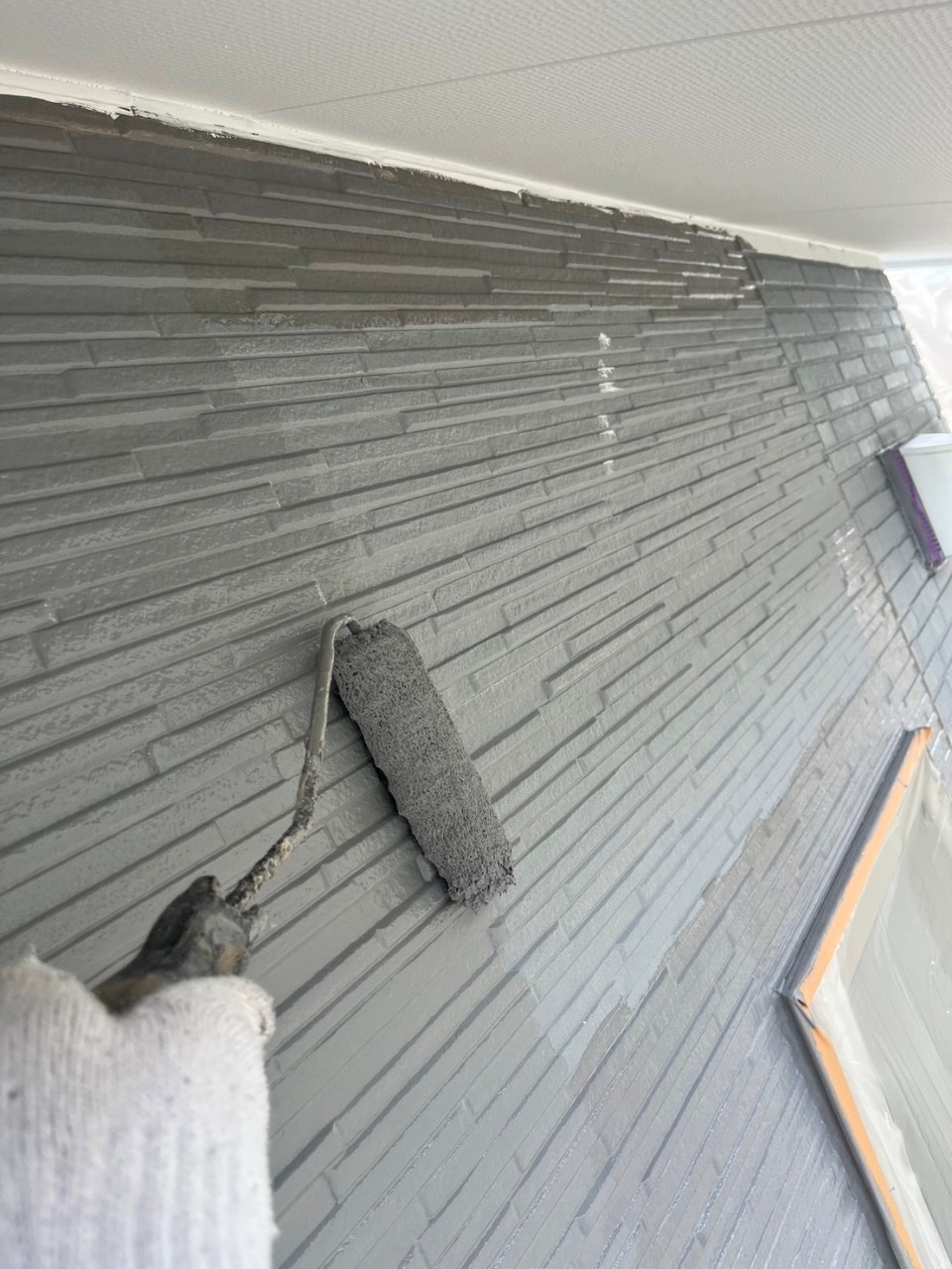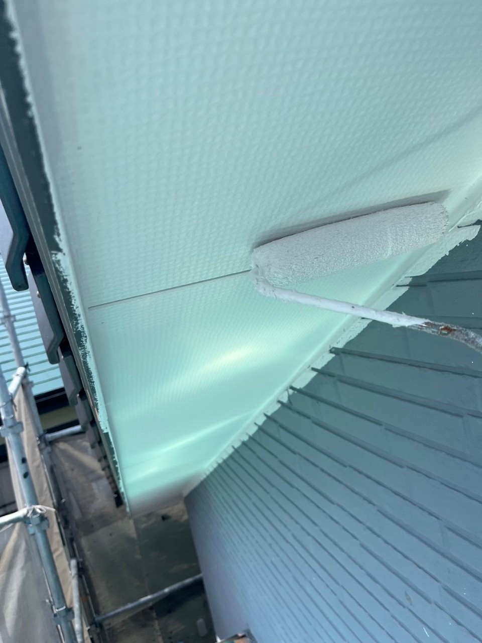 本日は軒天井塗装、外壁の中塗りの様子をお伝えいたします。