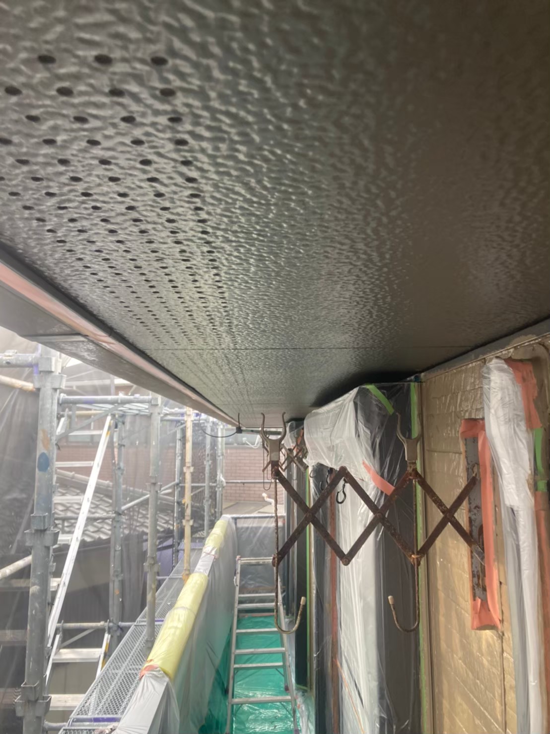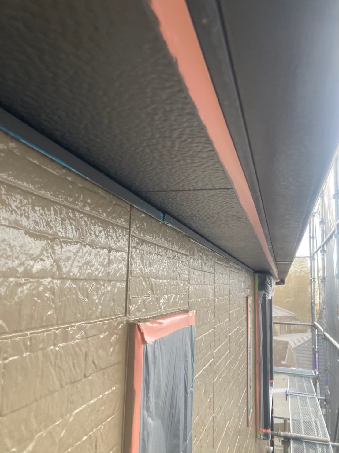 本日は軒天井塗装、屋根の中塗りの様子をお伝えいたします。
