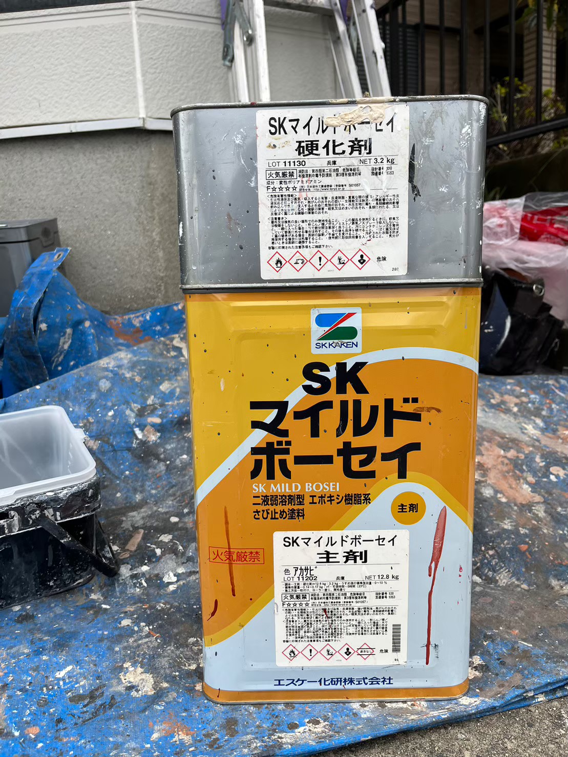 2液エポキシ系錆止め塗料にて下塗りを行っていきます。