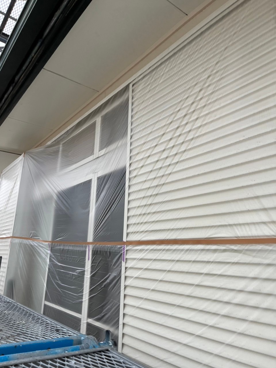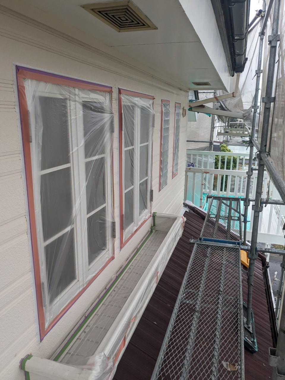 明日は外壁の下塗り、軒天井塗装の様子をお伝えいたします。
