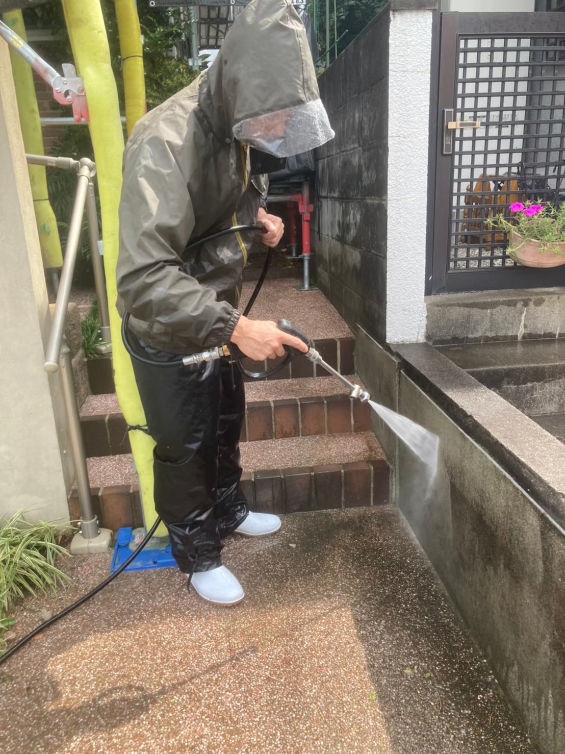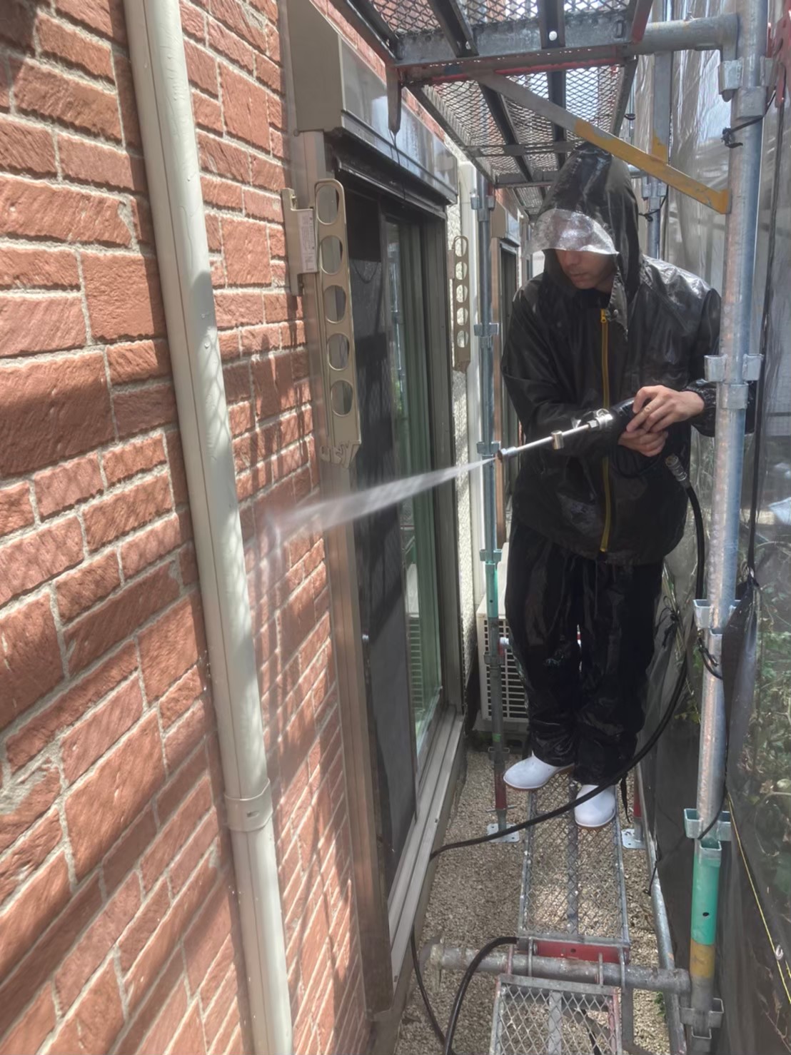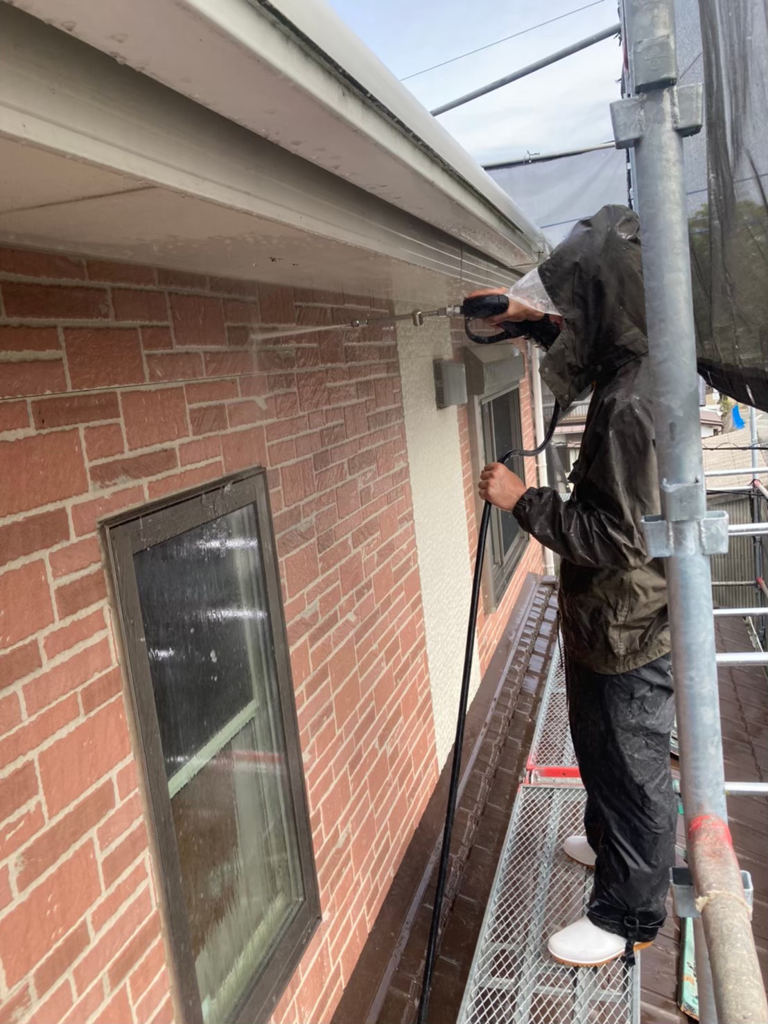 外壁はクリヤー塗装の為、素地を傷つけない様に丁寧に洗浄を行っていきます。