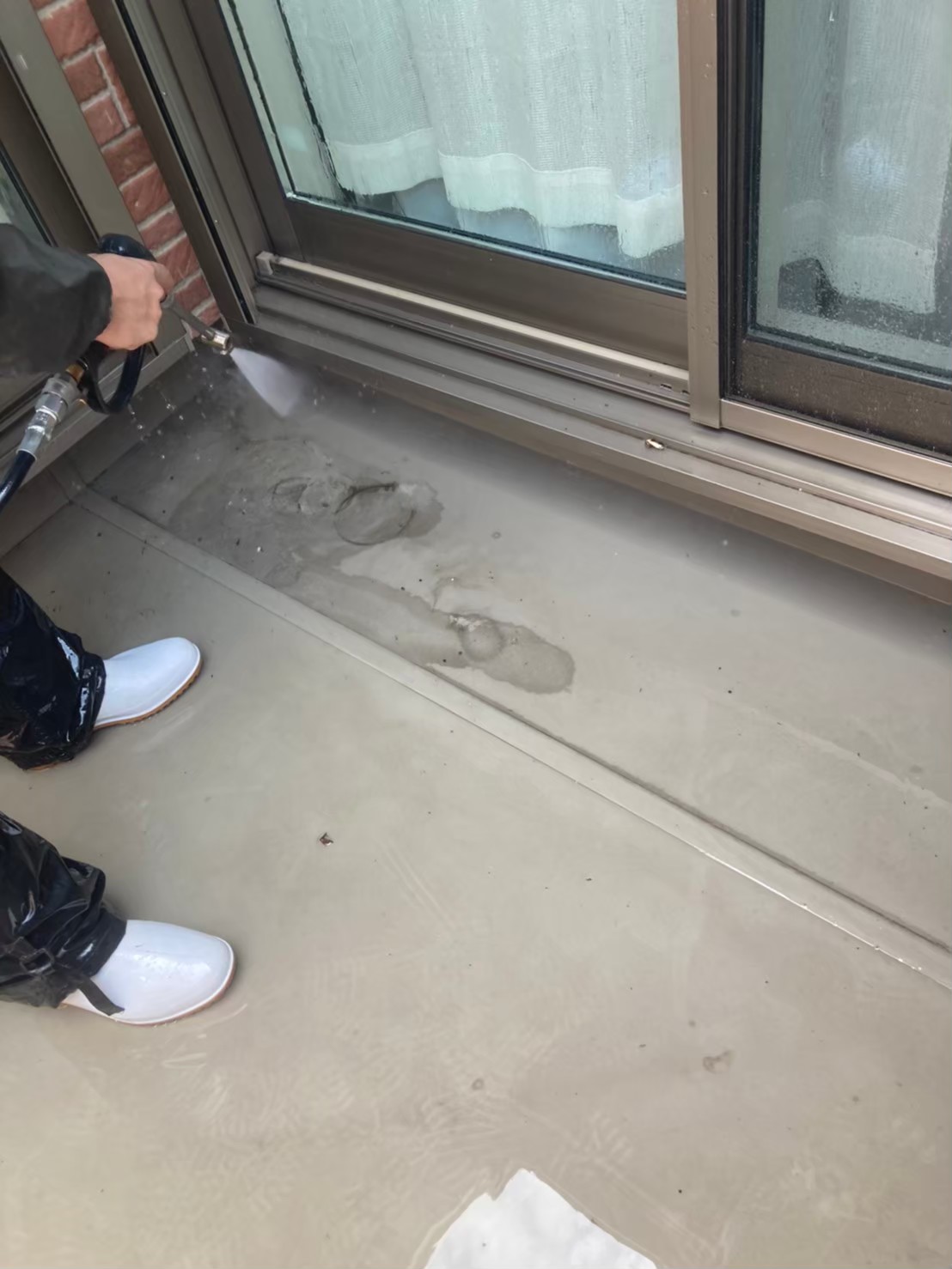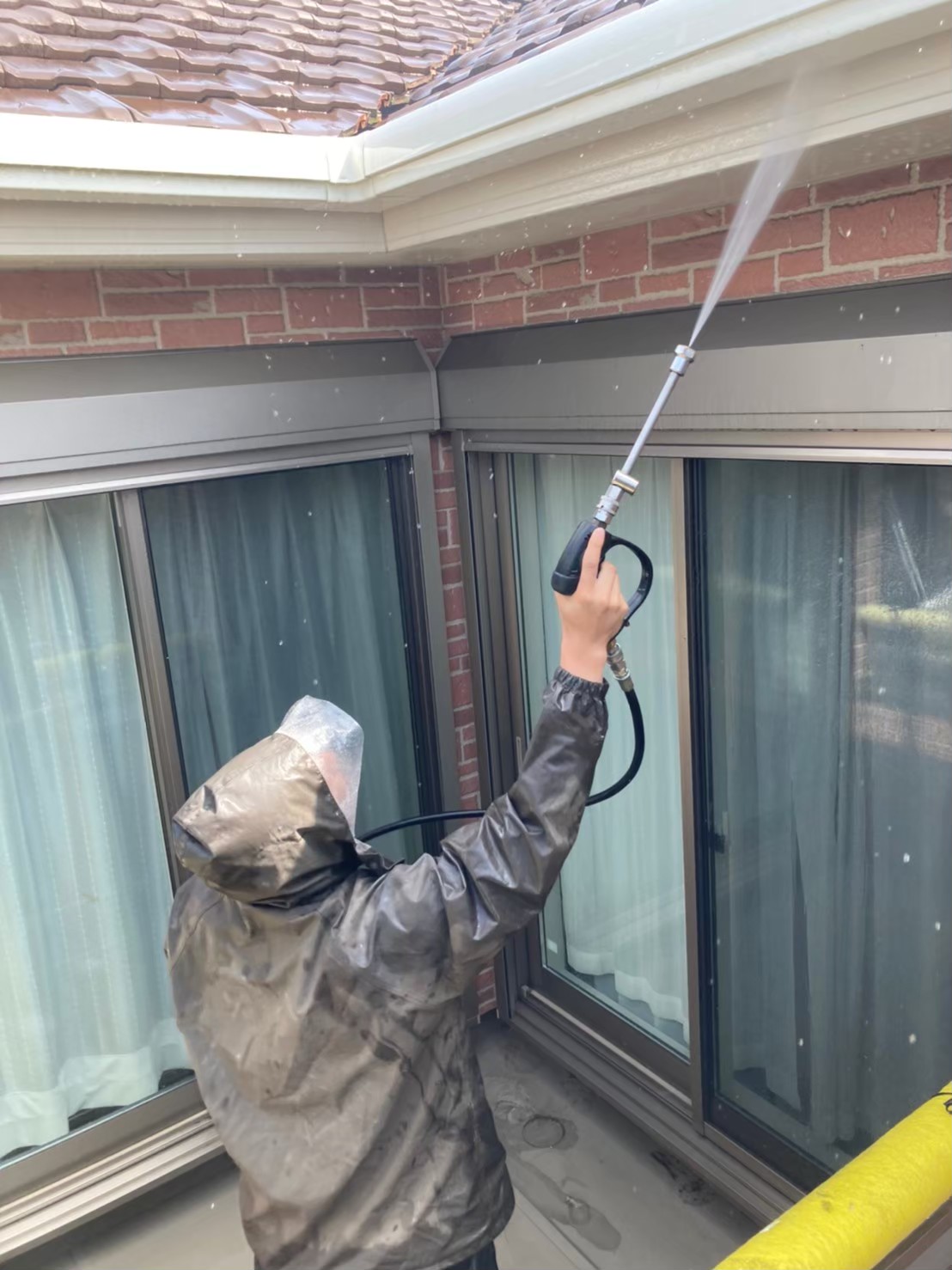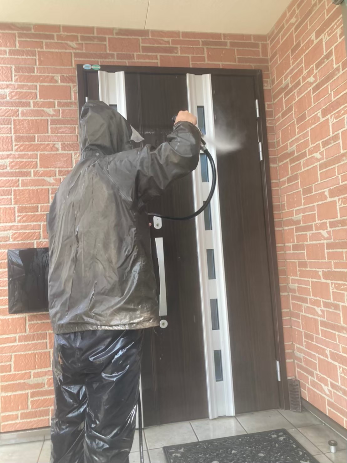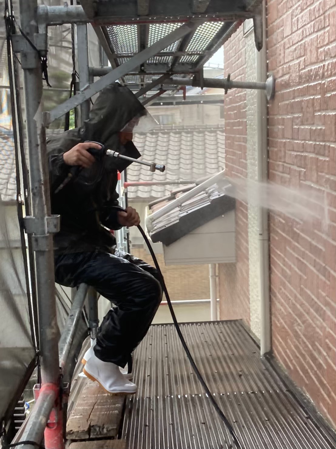 外壁はクリヤー塗装の為、素地を傷つけない様に丁寧に洗浄を行っていきます。