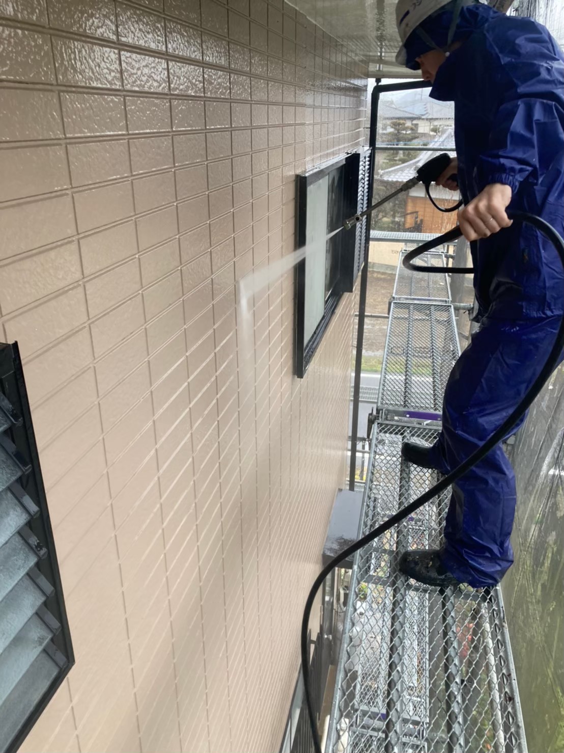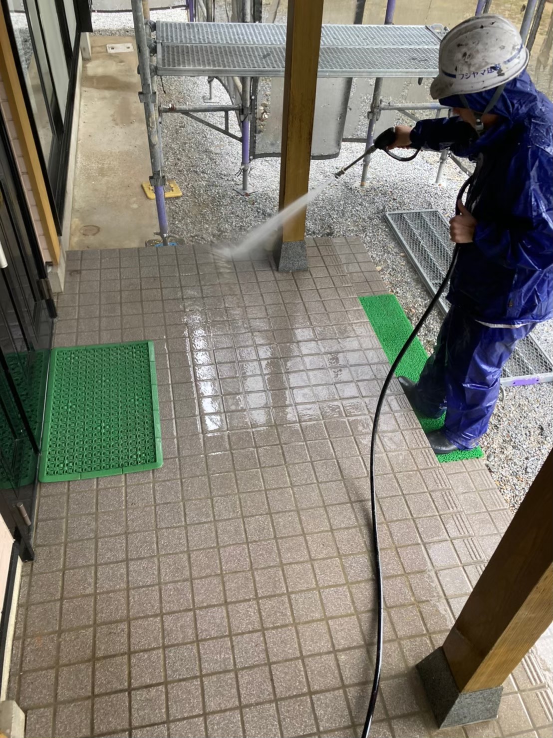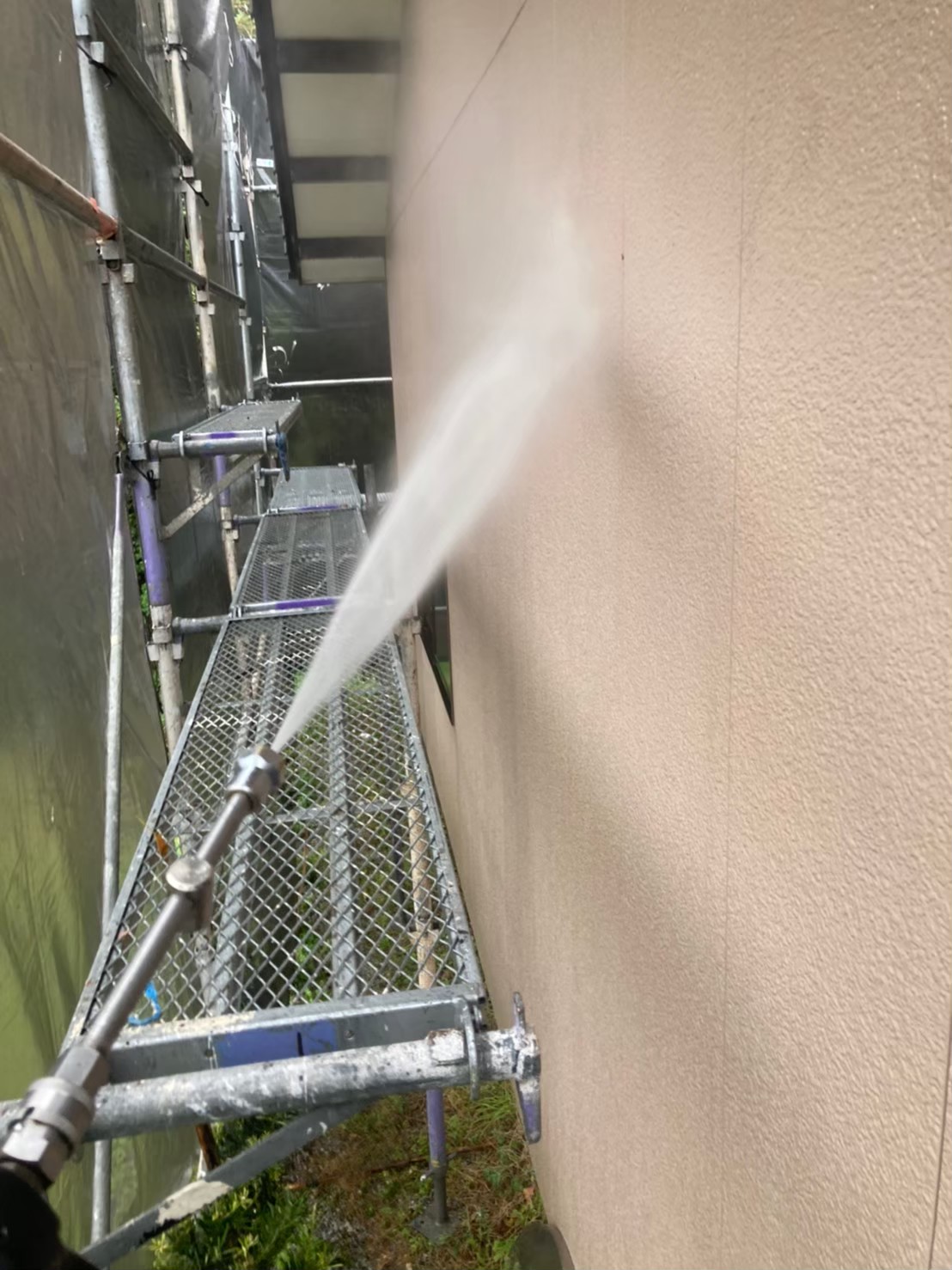 チョーキング現象が起きており、密着不良に繋がらない様、経年の汚れをしっかりと洗い流していきます。