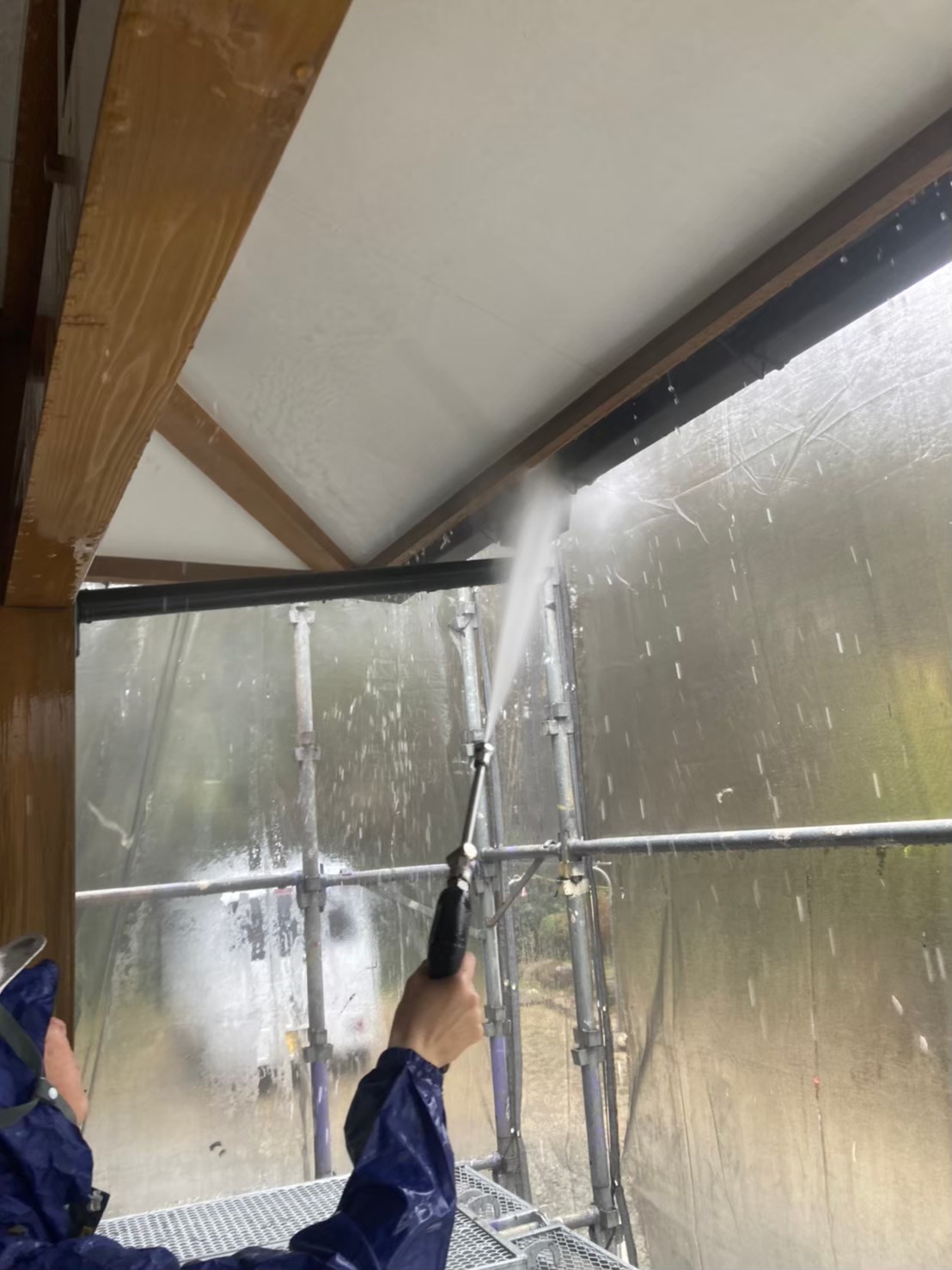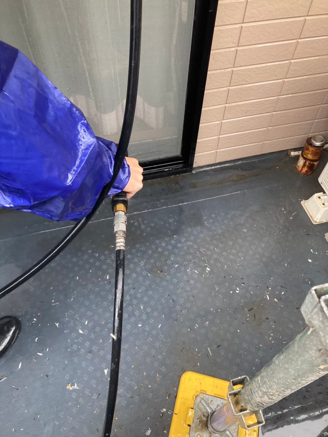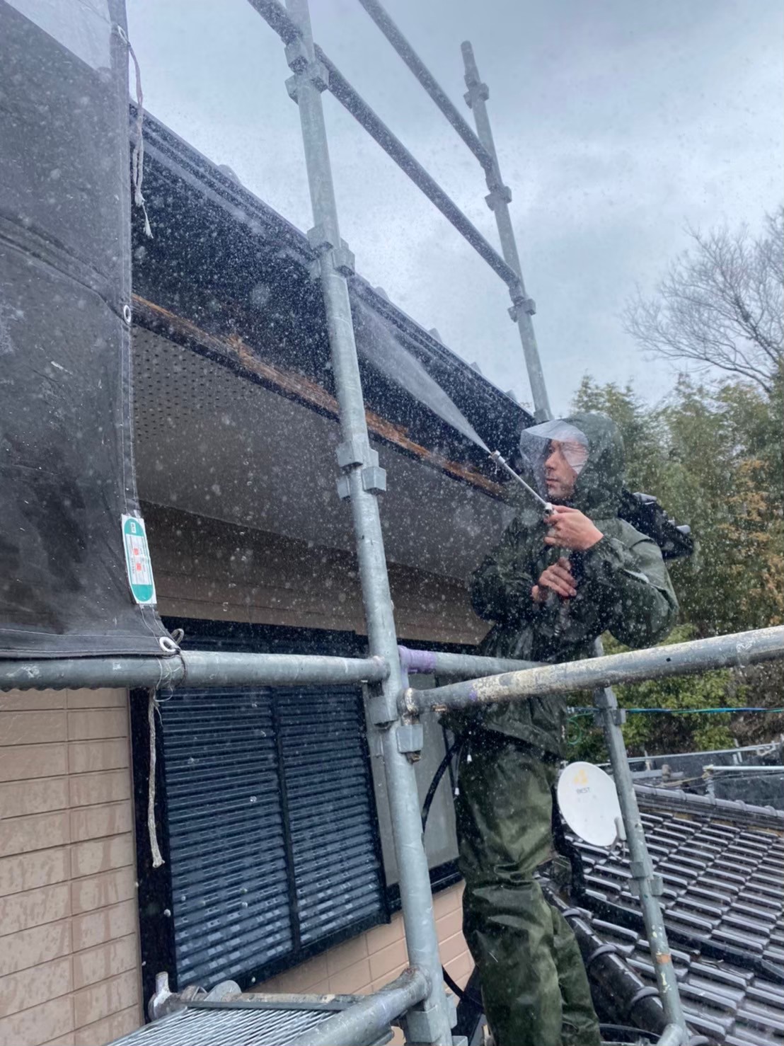 チョーキング現象が起きており、密着不良に繋がらない様、経年の汚れをしっかりと洗い流していきます。