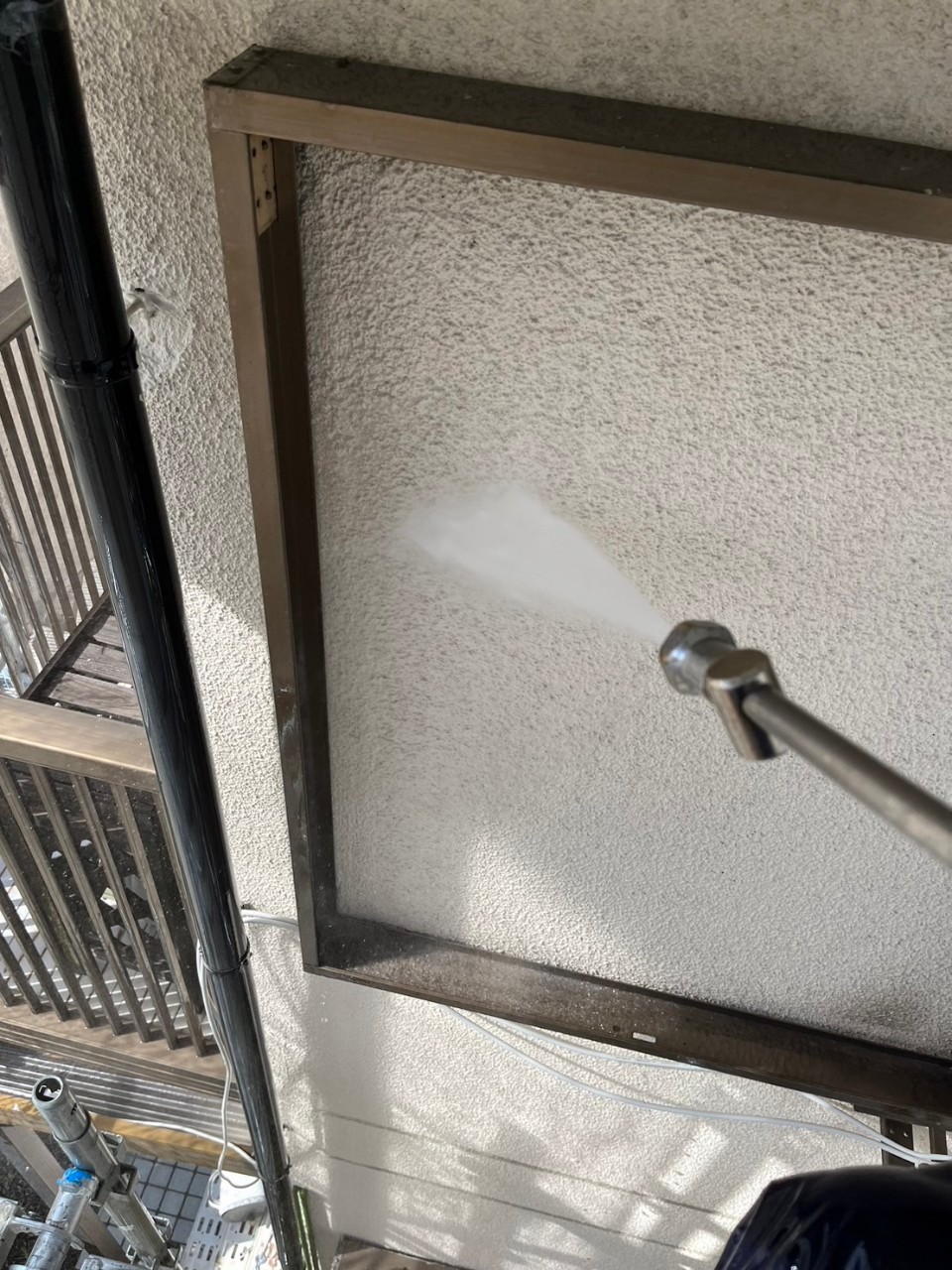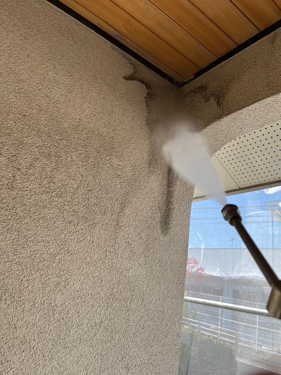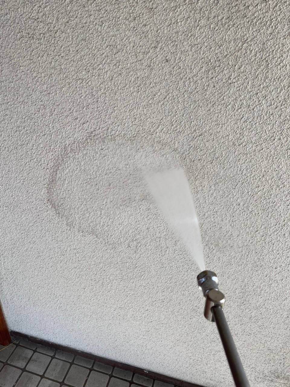 洗浄が不十分な場合は早期の剥離などに繋がり易いため、コケ、経年の汚れ、チョーキングなどもしっかりと洗い流していきます。