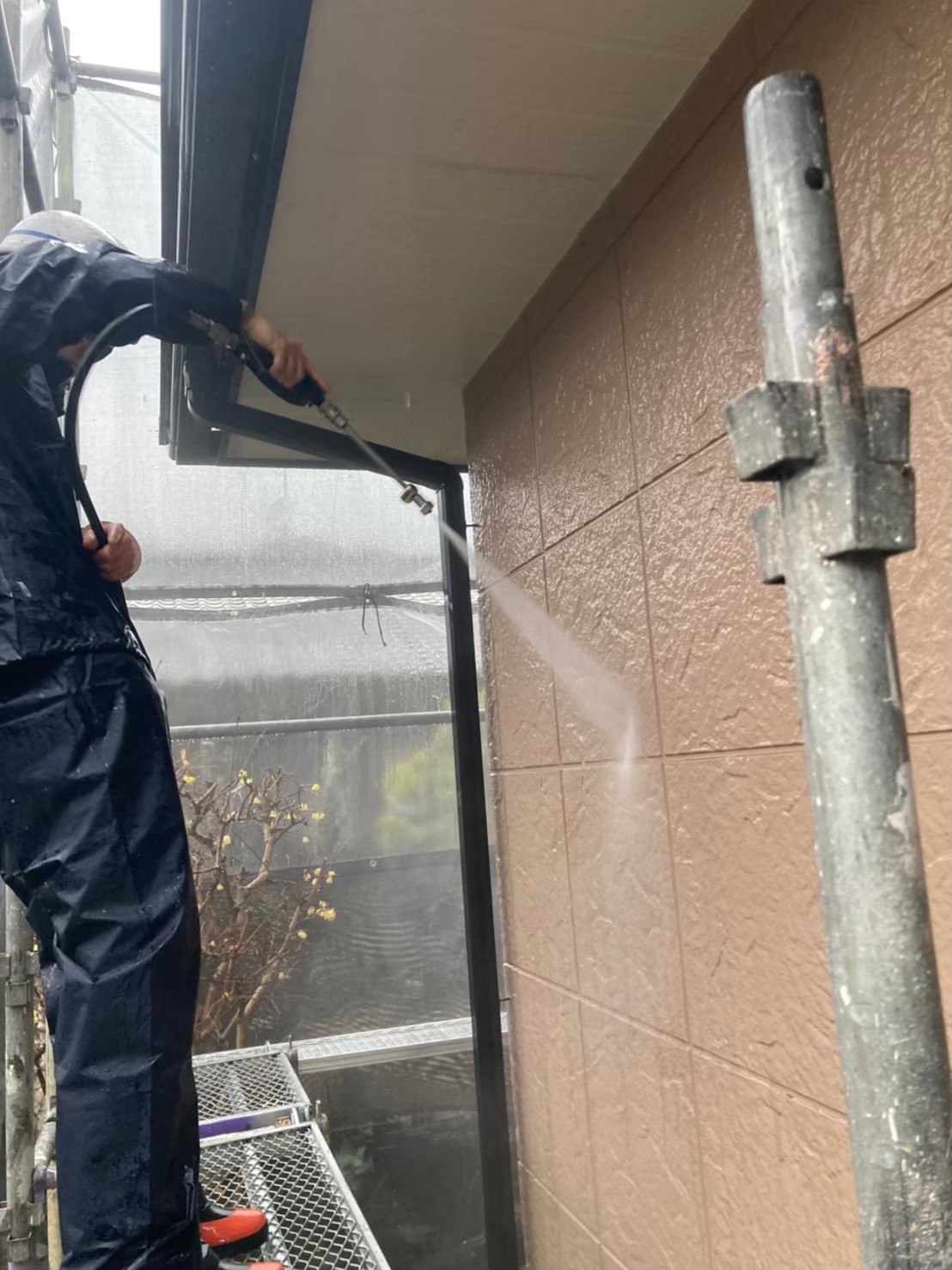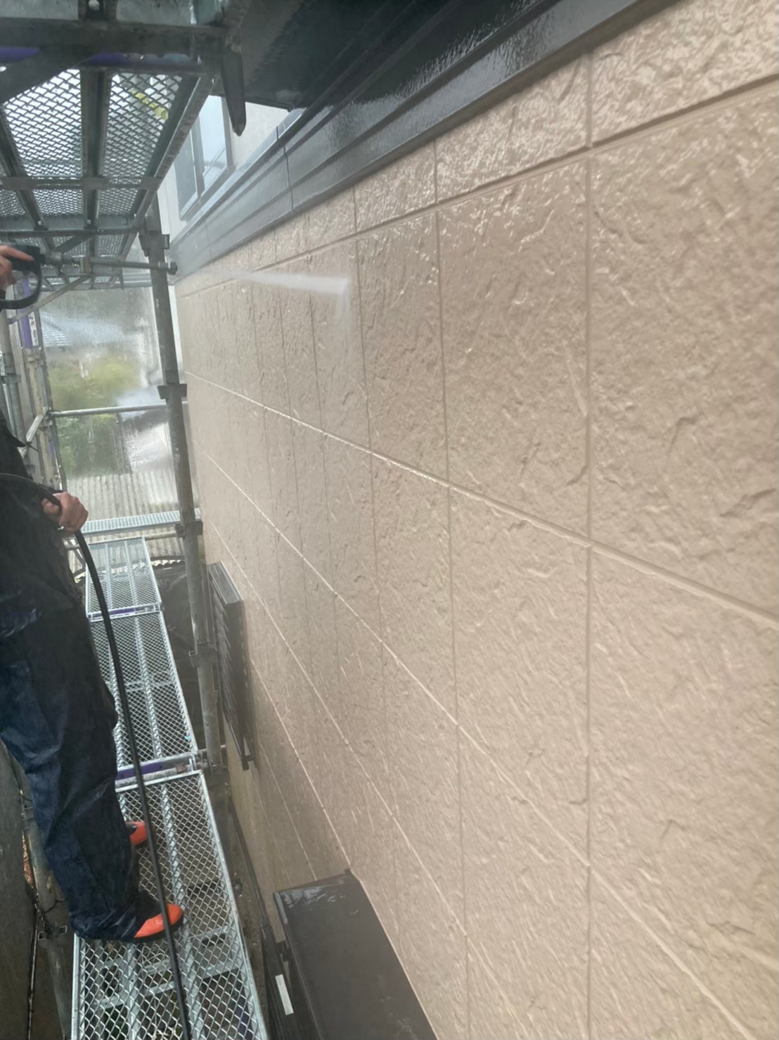 洗浄が不十分な場合は早期の剥離などに繋がり易いため、コケ、経年の汚れ、チョーキングなどもしっかりと洗い流していきます。