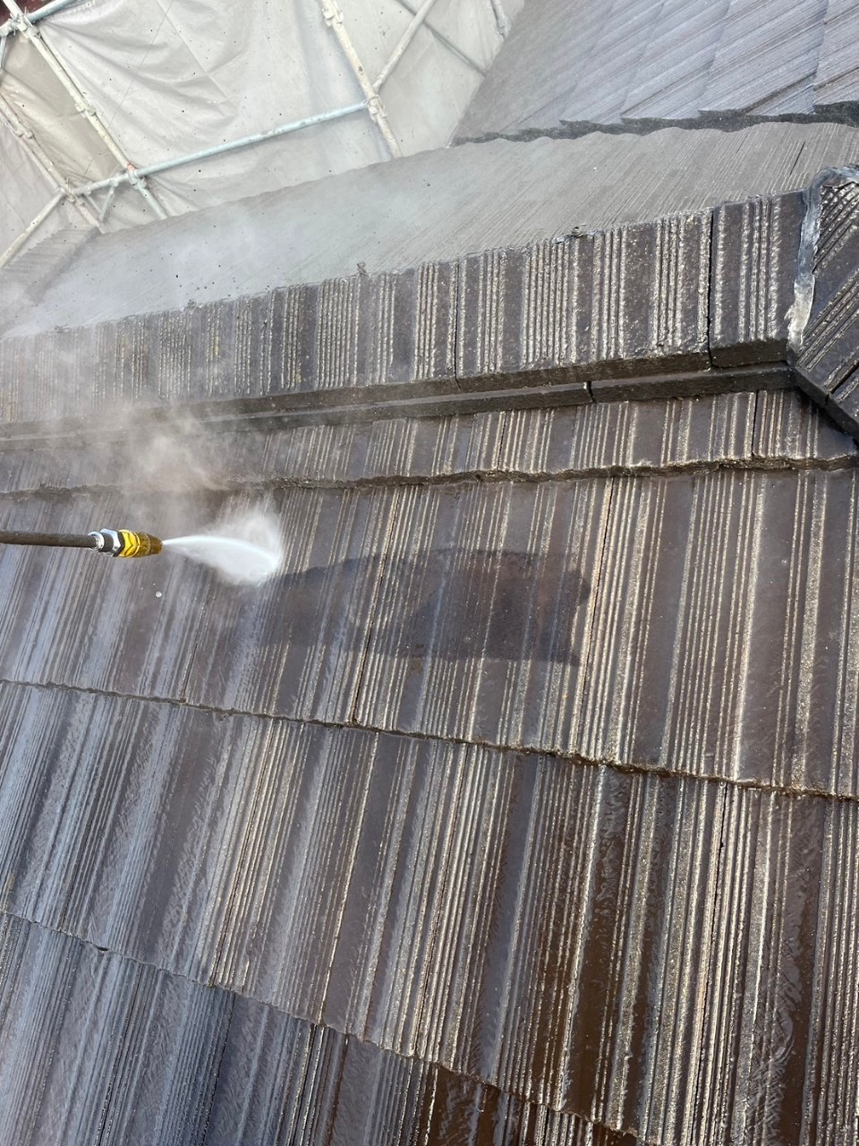 外壁も経年での劣化でチョーキング現象が起きておりますので、可能な限りしっかりと洗い流していきます。